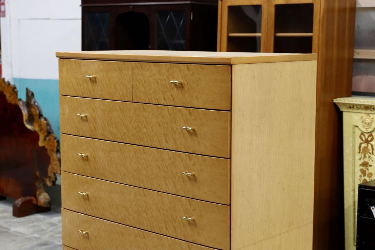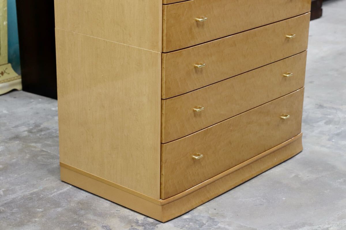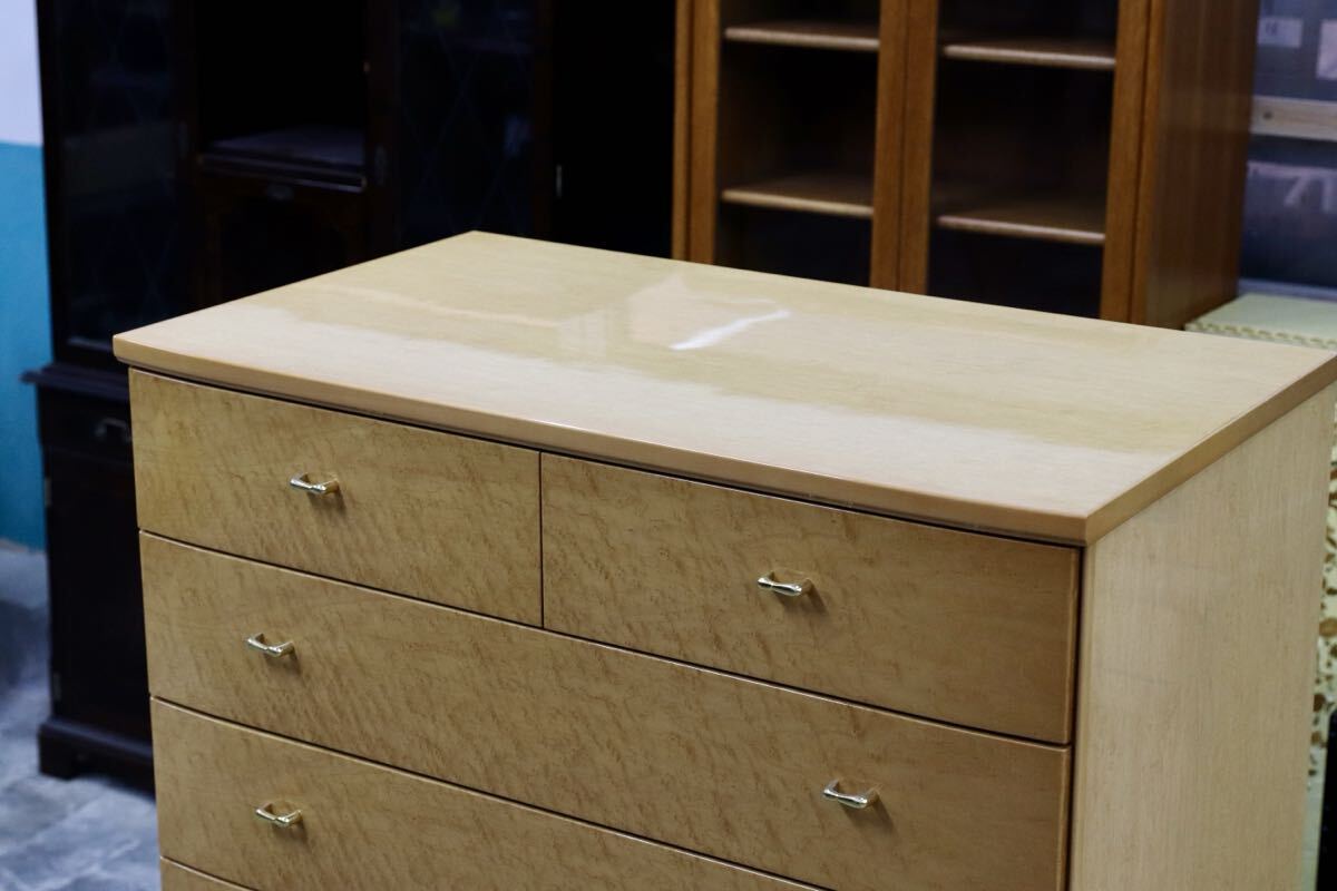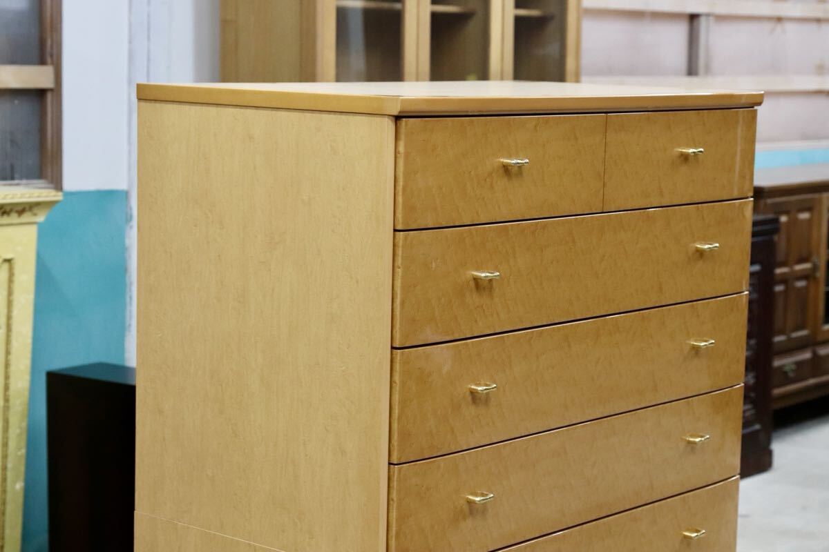 バーズアイメープルはハードメープルの中にごく稀に発生するもので、表面近くの1/5のみでしかとれない大変貴重な材で、丸い玉のような模様が連なったり、渦巻状になって現われる杢目で、鳥の目に似た模様が集まっているところから“鳥目杢”(とりめもく)と呼ばれています。神秘的な木目と衝撃に強く割れにくい性質から高級家具や高級車の内装材として使用されています。
