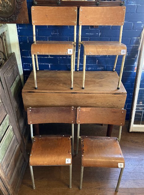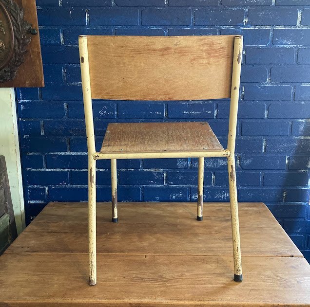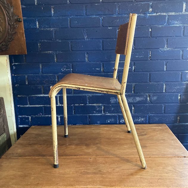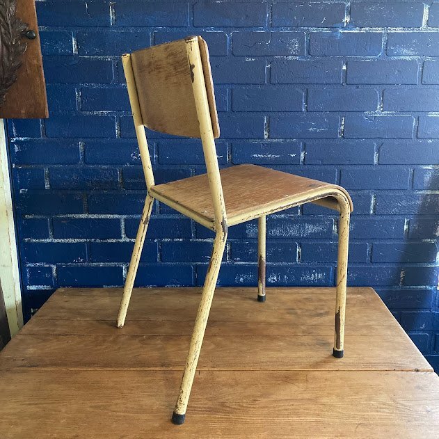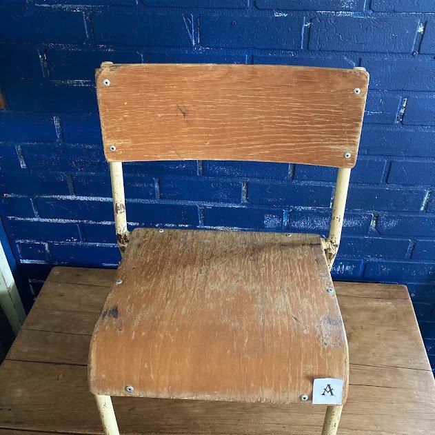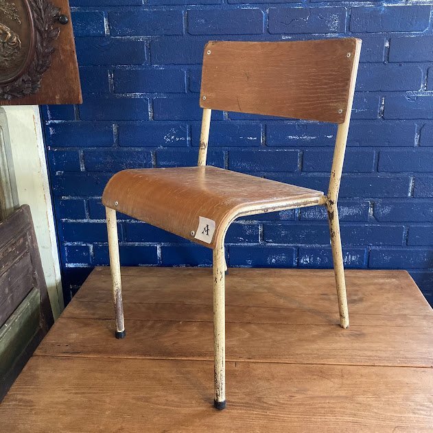 シャビ―な雰囲気が素敵で座面の高さが約36㎝の愛らしいキッズチェア。こちらは【A】フレームがややクリームがかった色にペイントされています。1950年代の英国ビンテージ。ケガをしないように丸みを帯びたネジを使用してあり、同じシリーズの椅子を重ねてすっきり収納できるようになっています。小さな子供達がワイワイ楽しそうに過ごす様子が目に浮かびますね!大人が楽しむ椅子として、毎日のバッグの定位置や、ディスプレイ台、花台、玄関で靴をはくサポート台としても程よいサイズです。ビンテージらしい風合いがお好きな方向き。福岡市南区の店舗にてお渡しもできますのでお気軽にどうぞ!