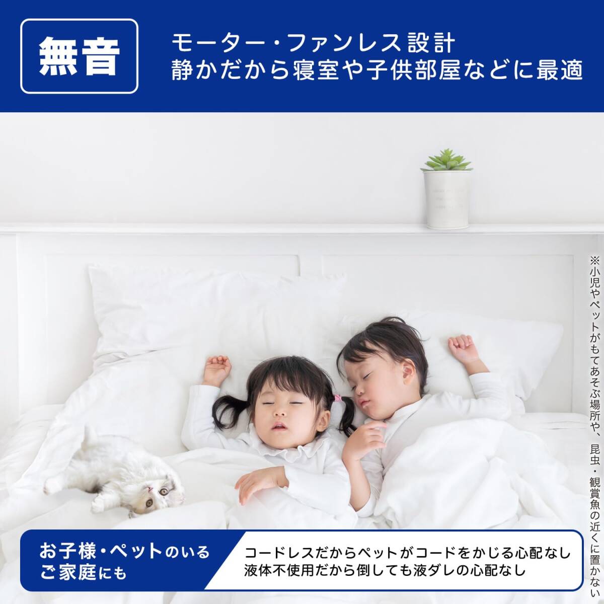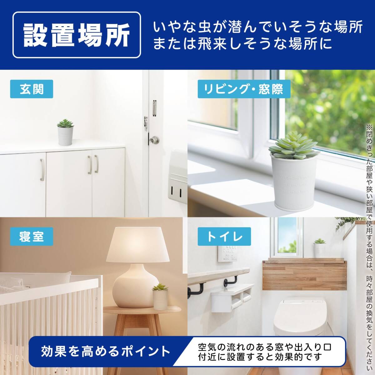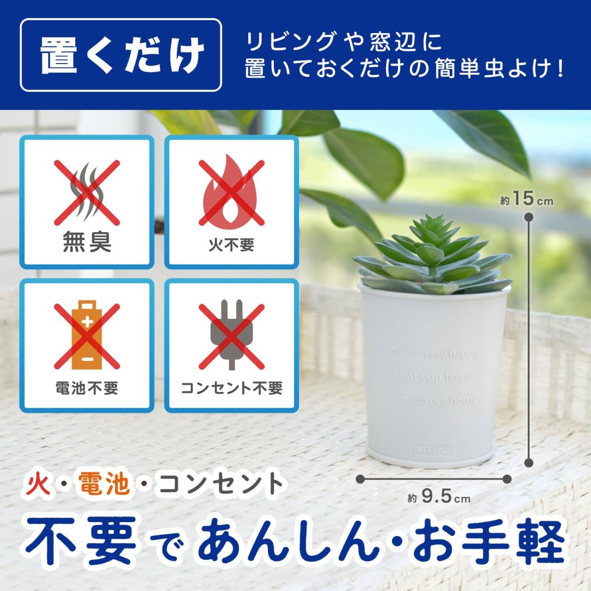 商品紹介 ●「虫こないもん」シリーズ初の1年持続タイプ! ●火も電池もコンセントも不要。 お部屋に置くだけの簡単虫よけ・殺虫剤です。 ●簡単・手軽な方法で室内の害虫を駆除します。 ●電気式のモーターやファンを使っていない無音ですので、寝室のベッドサイドや静かな場所にもピッタリです。 ●蚊取り線香のように火をつかわないので、こども部屋やペットの居る部屋でも安心です。 ●効果は1 ●空気の流れのある窓の近くや出入り口付近に設置するとより効果的です。 ●パッケージ記載のQRコードから使用開始登録をすれば、交換時期を自動メールでお知らせ。 ●虫よけ剤だと分かりにくいデザインでインテリアに馴染みます。 安全警告 子供やペットの手に届かないようにしてください。