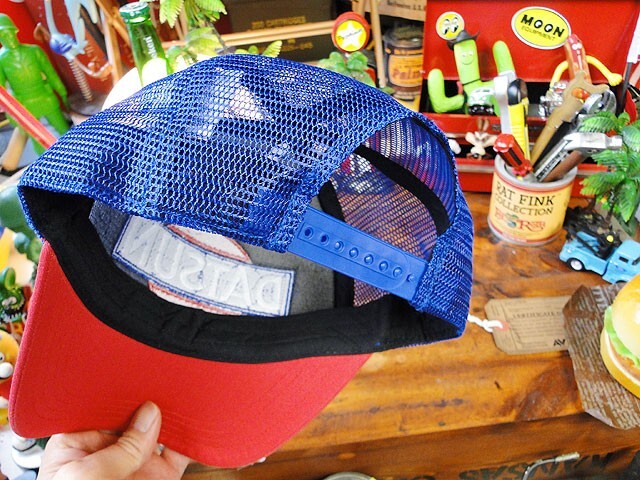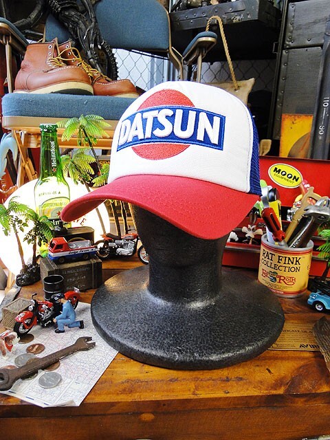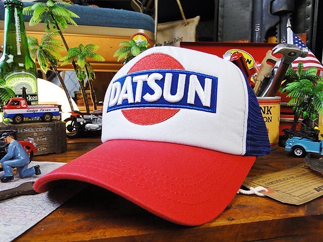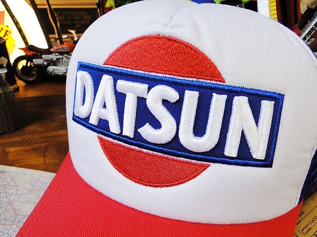 帽子は人気のトラッカーハットをベースに、後ろ側は通気のイイ、メッシュキャップタイプになっていて、正面にデッカク「ダットサン」って入ったドンズバなデザインになっています。