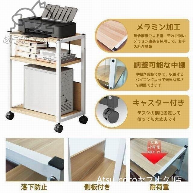【パソコンワゴン】天板には高密度のMDF集成材を使用しています、天板や棚板の表面には、熱や摩擦による傷、汚れに強いメラミン化粧板を採用する。高品質のスチールフレーム、しっかりして耐荷重が強いです(約40kg)。