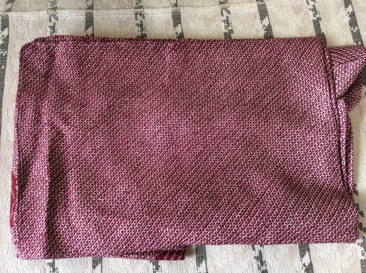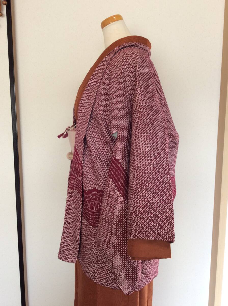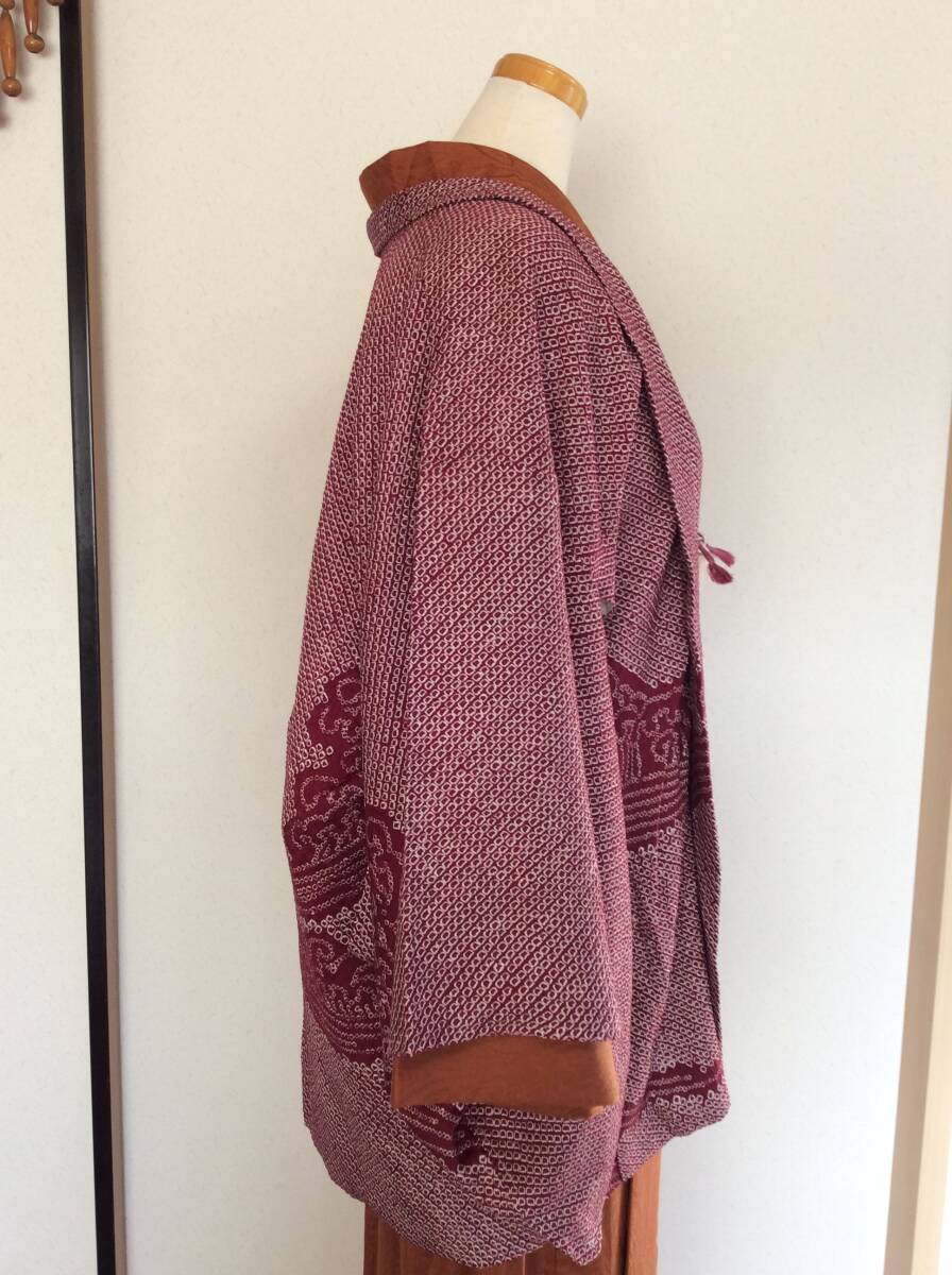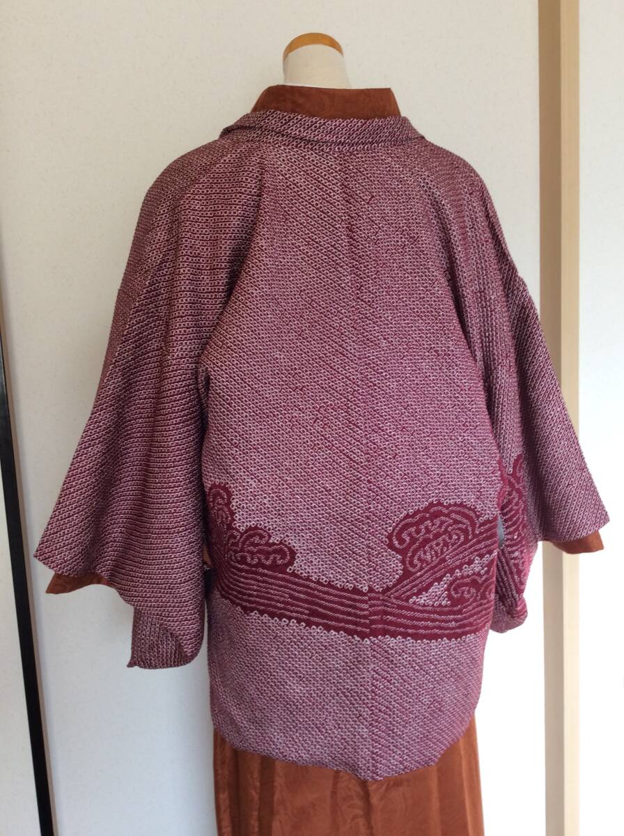 即決 アンティーク羽織 羽織紐付き 裄丈65 総絞り えんじ色 波柄 定形外郵便込 これからの秋冬シーズンの和装コーデに♪