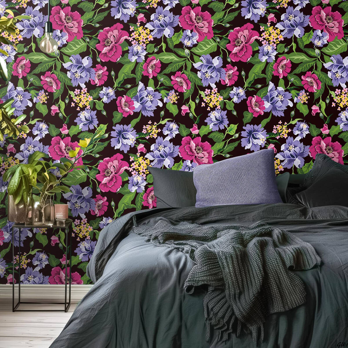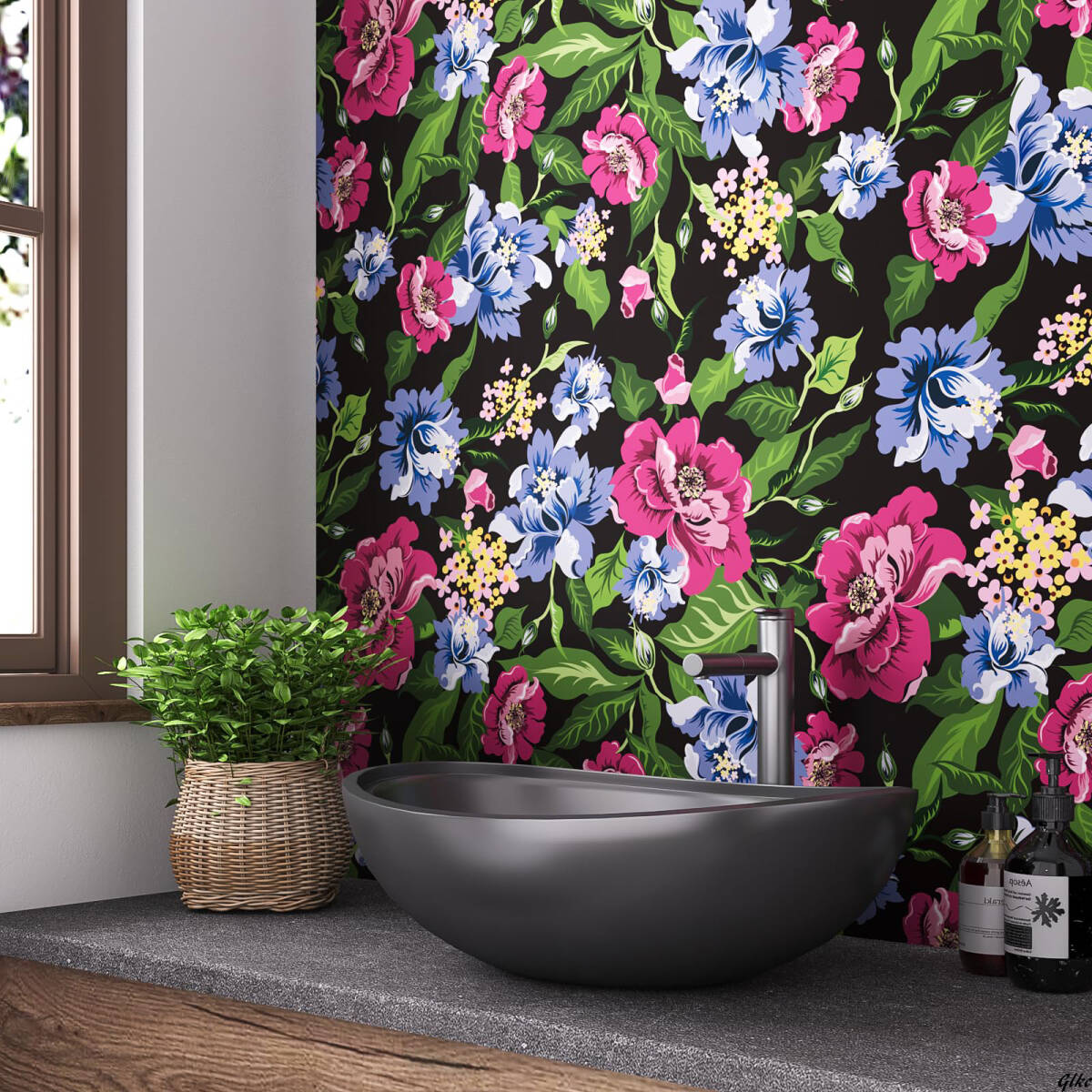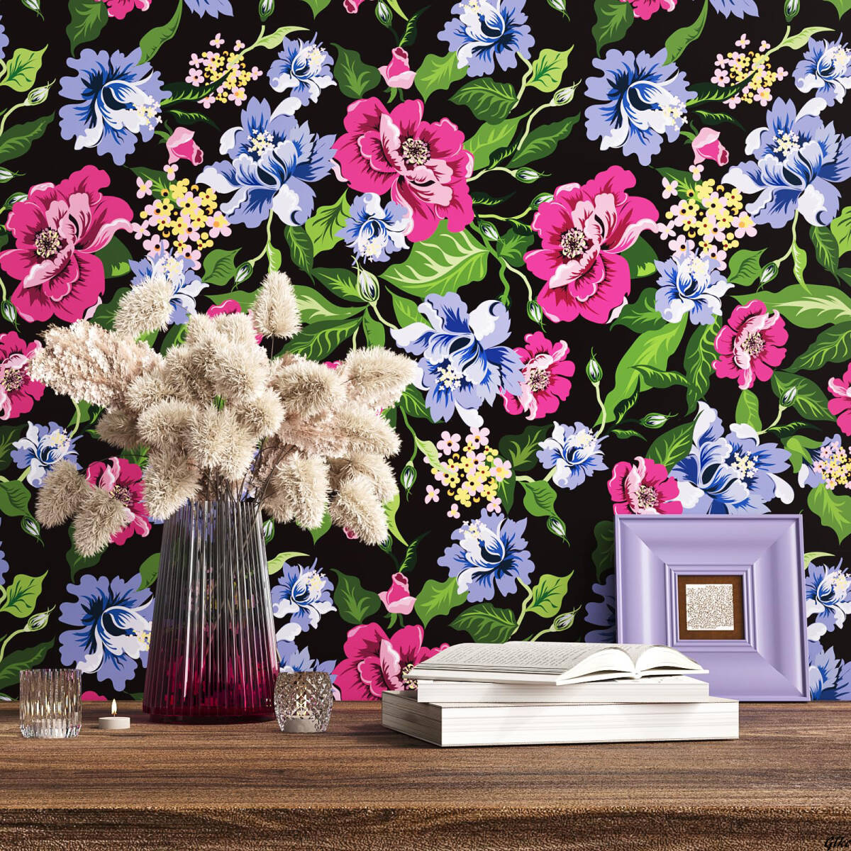 この花柄壁紙シールは、黒い背景に明るい青、ピンク、紫の花々が映え、