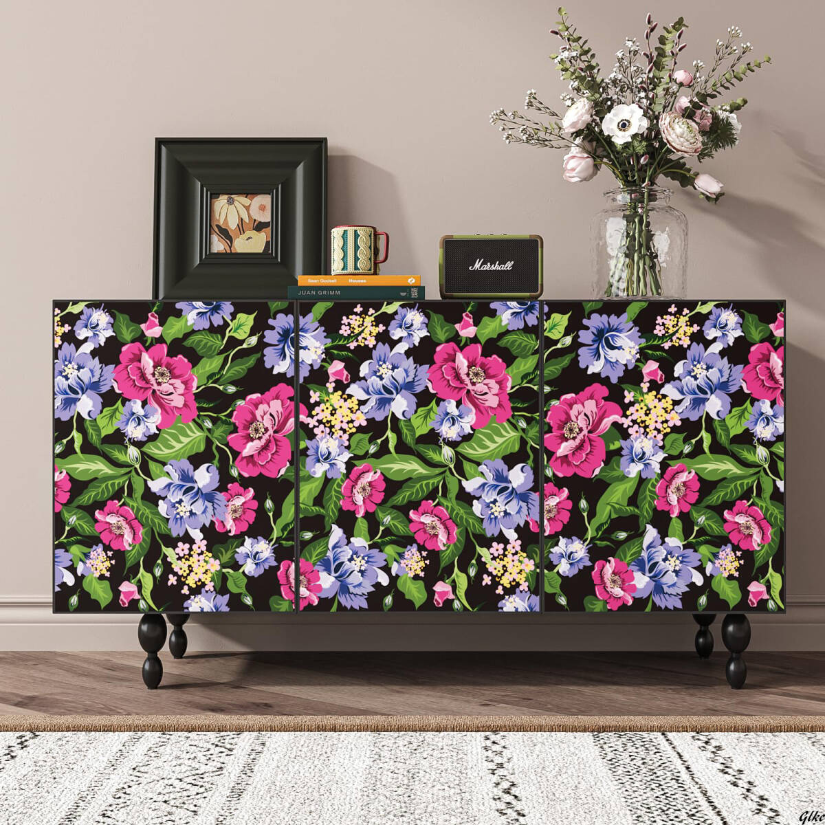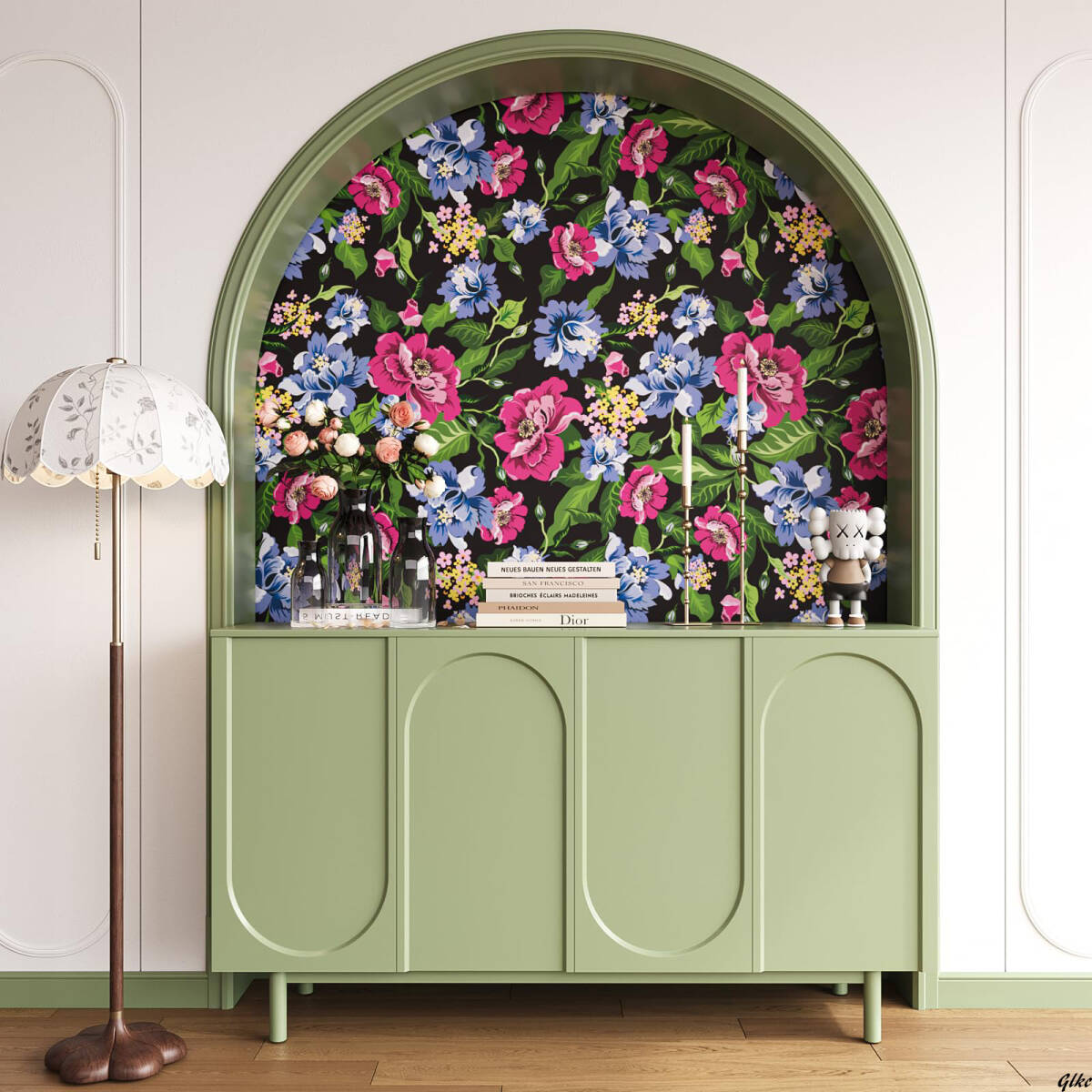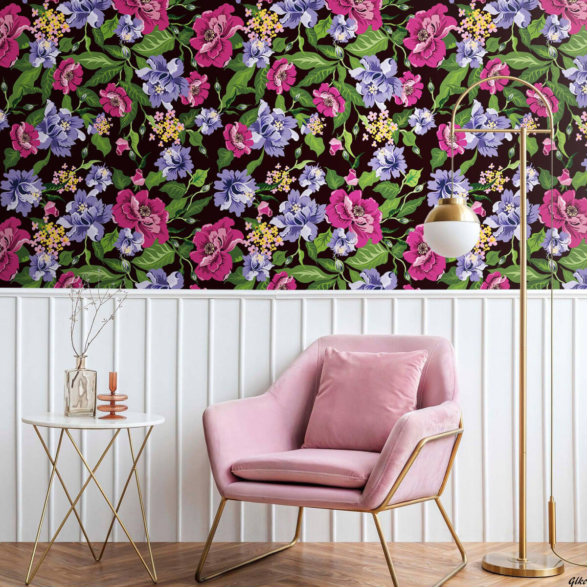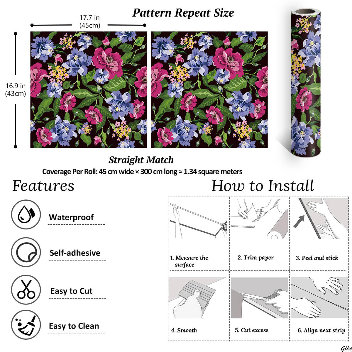 この花柄壁紙シールは、黒い背景に明るい青、ピンク、紫の花々が映え、