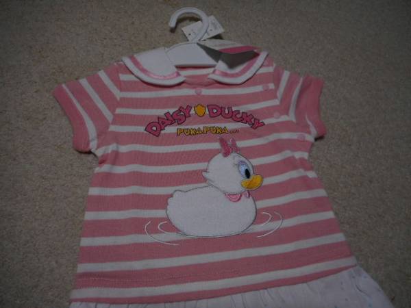 サイズ80cm。東京ディズニーリゾート、オリエンタルランドの品です。綿100%のカットソー。ドナルドダックのガールフレンド、ディジーダックがかわいらしいです。スカートに隠れたおむつのお尻もイカリマークでかわいいです。画像は暗めに写ってしまいましたがもっと明るい色目です。定形外可。