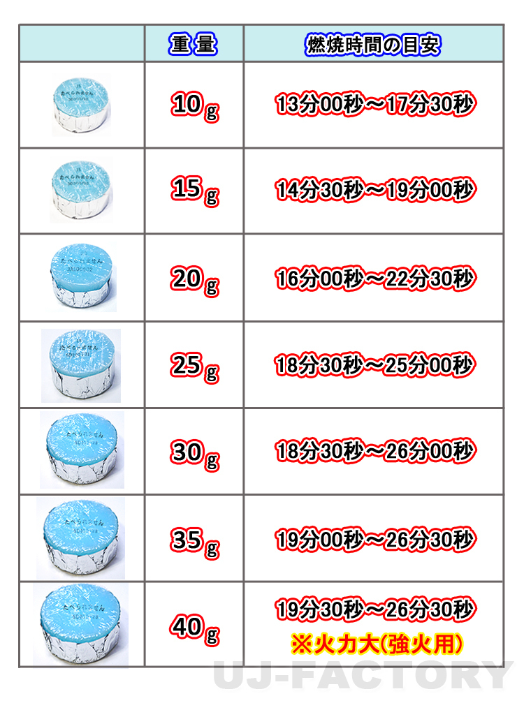 | 【 ここがポイント 】 ★多くのホテルや旅館で色々な料理に使用され、固形燃料の国内シェアナンバーワン! ★家族で好みの一人鍋が人気上昇中!また、アウトドアでの簡単調理に大活躍♪ ★炭や薪への着火材としても使用可能です。 ★カエン・ニューエースEの特徴 ①1個ずつ親切表示:すべてに製品サイズ(グラム数)と「食べられません」を表示しています。 ②手間いらず:アルミ箔のカップでそのままコンロに!廃棄も簡単です。 ③確実に着火:ロングライターの火で、直ぐに着火します。 ④すばやく加熱:初期火力が強いので、料理をどんどん加熱。 ⑤燃焼状態が安定:料理の出来上がりにバラつきがありません。 ⑥臭いが少ない:消臭剤配合で、消化時の臭いを低減(一部商品除く) ※製品は10g・15g・20g・25g・30g・35g・40gで、用途に合わせて最適なサイズをご利用ください。 【重要】 ※保管する場合は、固形燃料の特性上、長期間空気に触れますと気化しますのでラップやジップロック等でくるみタッパー等で密封した状態で保管することをお勧めします。
