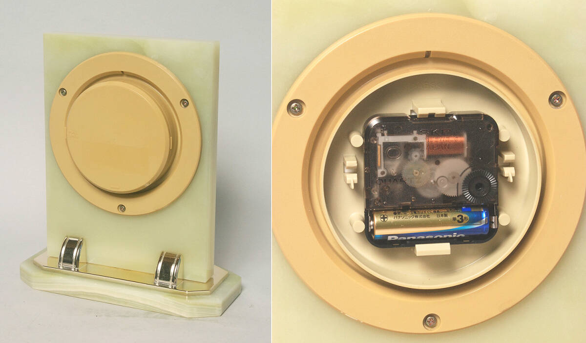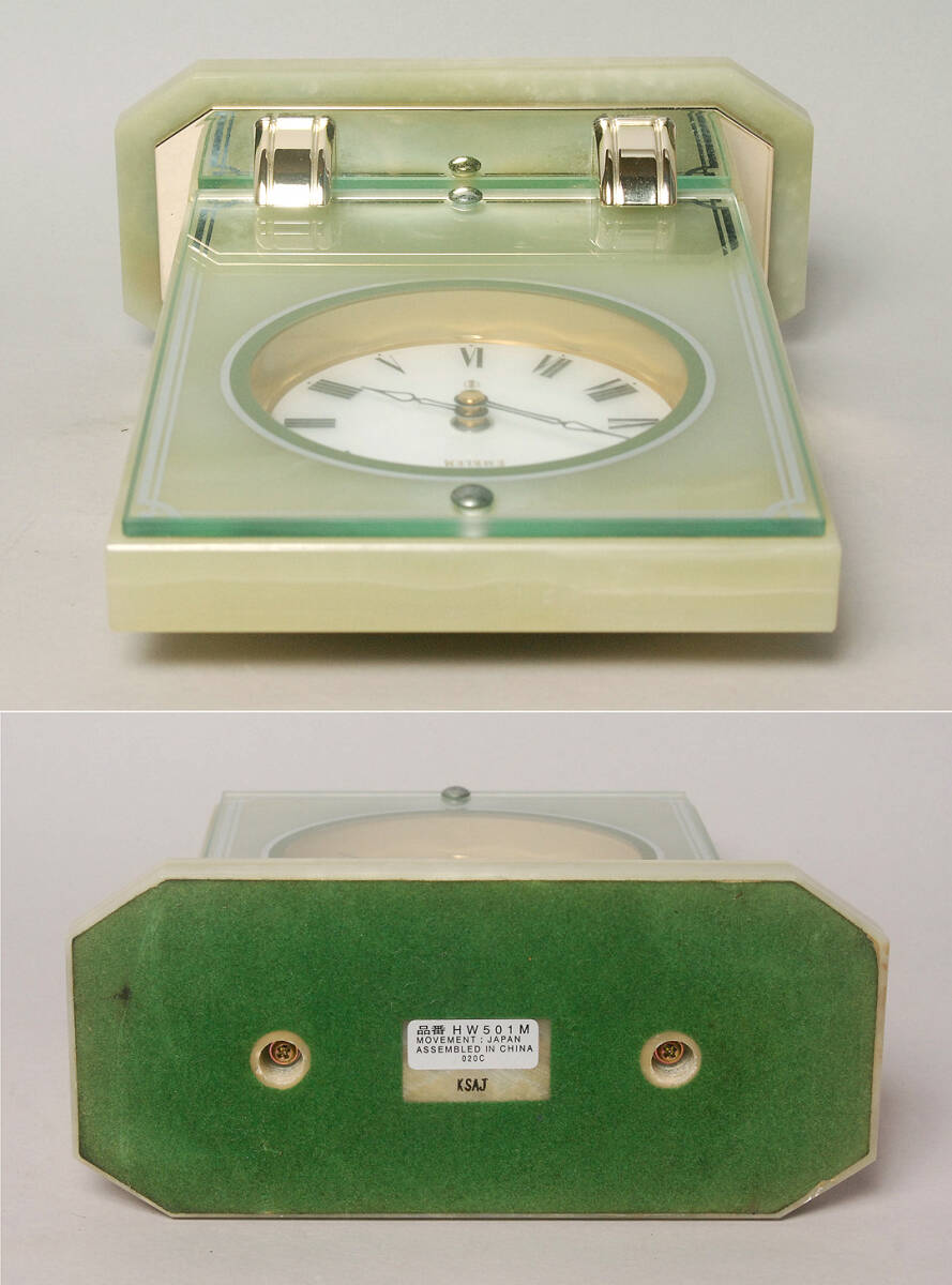 | * 商品説明 * セイコーの置き時計「EMBLEM HW501M」です。高さは約22cm、本体の幅は約14.5cm、本体部の厚さは約2.5cm(時計室含まず)、底部の幅は約19cm、奥行きは約8.5cmで、重さは約2314gです。淡い黄緑色で上品な感じの時計です。本体も2.3Kg以上と重いのでプラスティック製ではなく、石と思います(天然石か何石なのかは??ですが)。特に目立つキズや汚れは無く、キレイです。ぜひお役立てください。 * 発送説明 * |