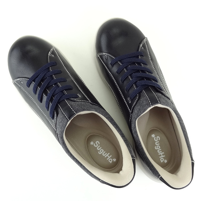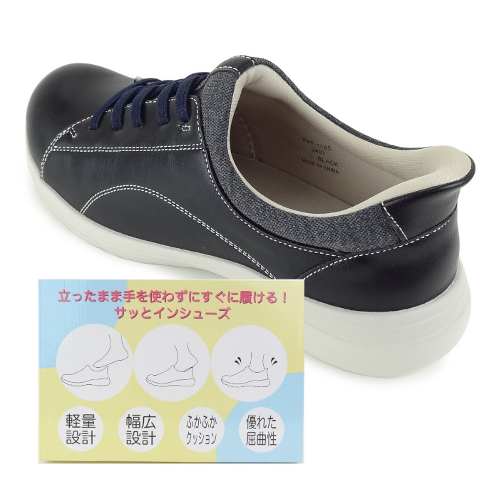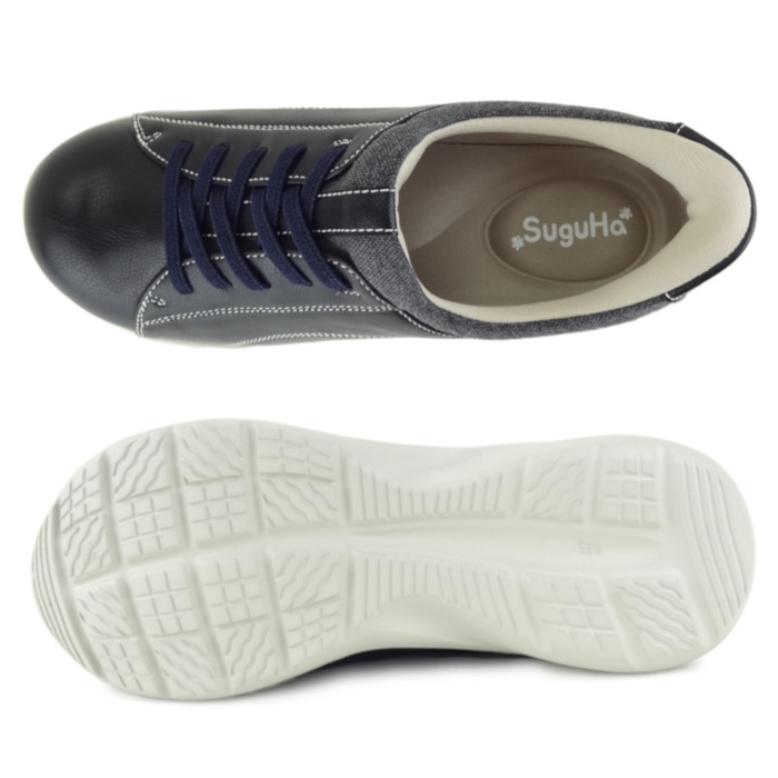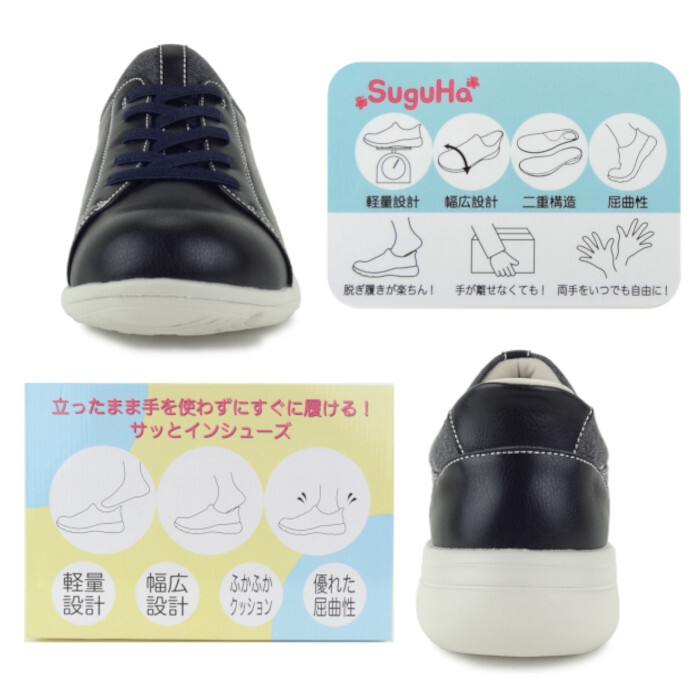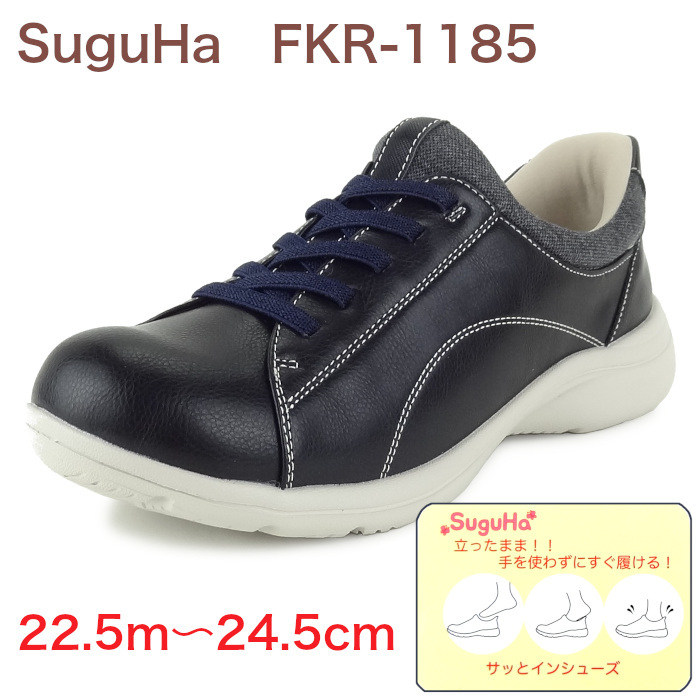 ブランド名:SuguHa 品番:FKR-1185 カラー:ブラック 黒 クロ くろ サイズ:23.0cm 靴の幅:3E EEE 片足重量:約165g(23.5cmで計測した場合) かかと高さ:約3.0cm 素材:合成皮革、合成底 生産国:中国 本商品は未使用新品です。 履き口が広めに作られ、かかとに芯が入っているため手を使わずに履ける「サッとインシューズ」、レディースカジュアルシューズです。甲の飾りひもはゴムになっています。 軽くて履きやすい靴なので毎日のお出かけや普段履きに最適です。散歩やタウンウォーキングなど、ちょっと歩くのにちょうどいい!お誕生日や記念の贈り物、プレゼントなどにも喜ばれると思いますよ! | ||