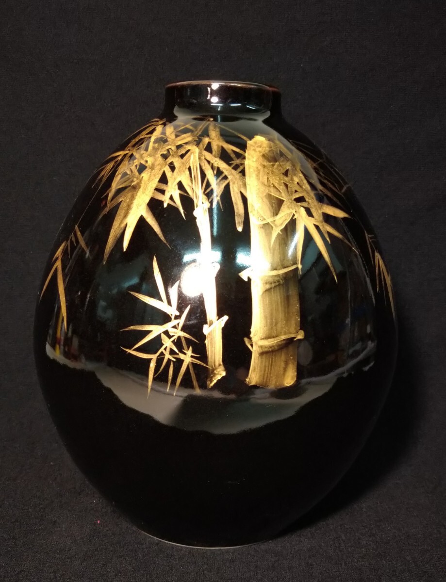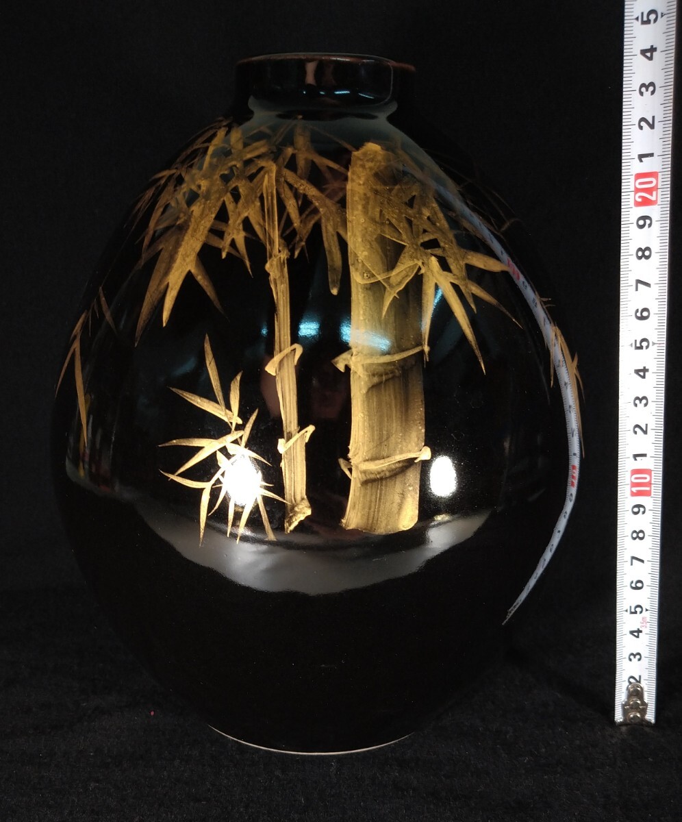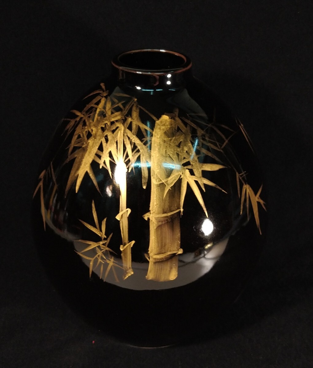 黒漆のような深い漆黒に、丁寧な金彩による竹林が立体的に描かれた、北村隆(1946-)先生の魂を感じさせる美しい花器でございます。素人採寸で申し訳ございませんが、径18.8cm、高さ24.4cmでございます。ps 漆などの光を反射するお品の撮影は苦手でございまして、写真では下半分に白いテーブルの映り込みがございます。全躯漆黒でございます。