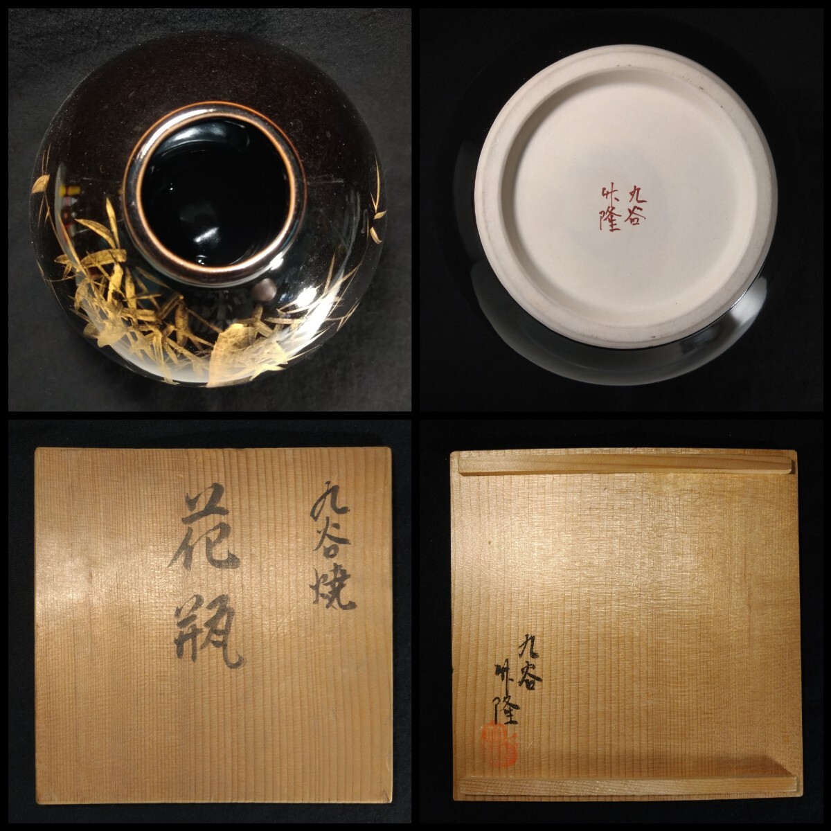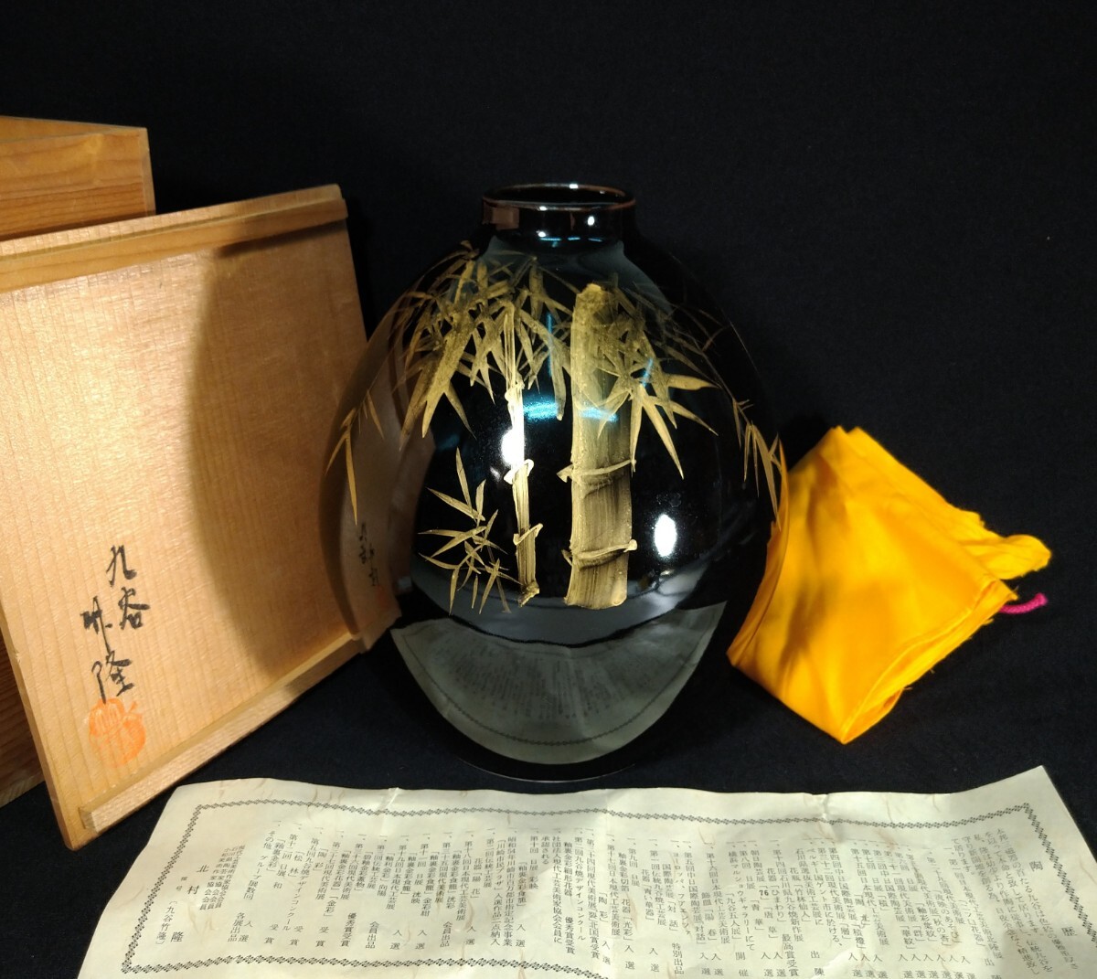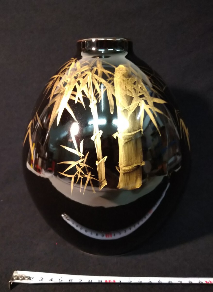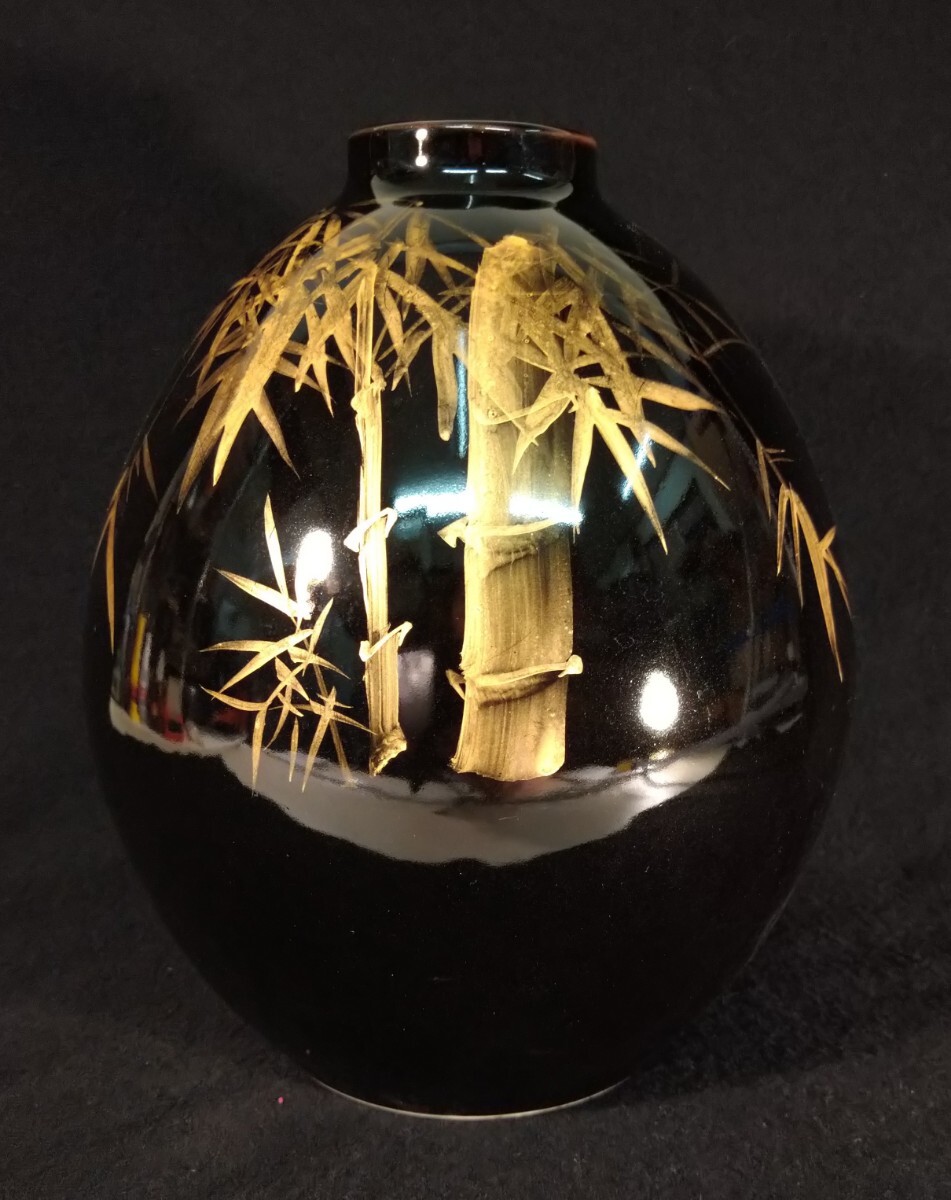 黒漆のような深い漆黒に、丁寧な金彩による竹林が立体的に描かれた、北村隆(1946-)先生の魂を感じさせる美しい花器でございます。素人採寸で申し訳ございませんが、径18.8cm、高さ24.4cmでございます。ps 漆などの光を反射するお品の撮影は苦手でございまして、写真では下半分に白いテーブルの映り込みがございます。全躯漆黒でございます。