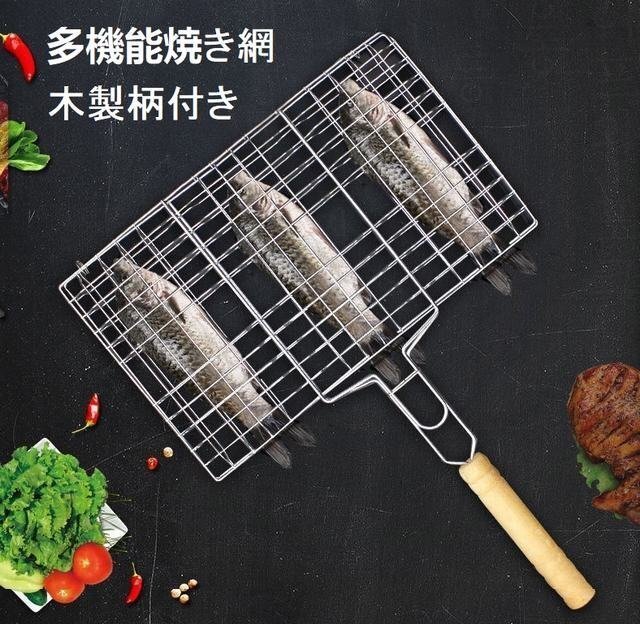 多機能焼き網 炭焼き 焼き網 炭火魚焼き器 焼き魚 木製柄付き バーベキュー 焼物用品 調理器具