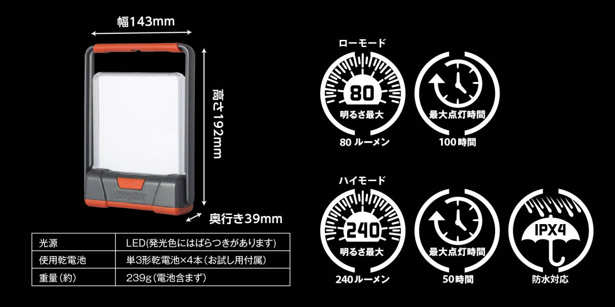 | 商品説明 | 製品:ENERGIZER エナジャイザー LEDフュージョンコンパクト ランタン FCL411 [240ルーメン/80ルーメン/軽量、吊り下げ照明も/防水IPX4] です。 大手家電量販店購入の新品です。 (新品ですがパッケージは製品の雰囲気がわかるようにと、ご覧の作りです。 完全密閉されているようなパッケージングではないです。 メーカーのパッケージ仕様です。 経年上の軽微なスレや汚れやイタミはご容赦下さい) なお、FCL411はその後パッケージがリニューアルされて 白いパッケージになりました。そちらは密閉された感じのパッケージングになっております。 (同時期出品中です) 即決です。消費税はかかりません。 ◆製品 スリムでコンパクト エナジャイザー独自の技術、明るいのにまぶしくない省エネ技術 「ライトフュージョンテクノロジー」採用の『LEDフュージョン』シリーズ。 スリムでコンパクト、そして軽量タイプのランタンが新登場。 ■ハイモード:明るさ最大240ルーメン ■ローモード:明るさ最大80ルーメン ■点灯時間最大50時間 (ローモード使用時最大100時間) ■防水性能あり IPX4 ■薄型・軽量なので 吊り下げ用に。 非常時の備えにも。 ◆詳細はメーカーサイトで確認して下さい https://www.koizumiseiki.jp/energizer/product/product-1029/ ・FCL411 Compact Captions 0716 20Mbps (Energizer(エナジャイザー)公式チャンネル) https://www.youtube.com/watch?v=C1bnIVueITk *** 『あなたがアクセスしようとしているリンク先は Yahoo! JAPANのサイトではありません。 IDやパスワードを要求するサイトにご注意ください。』 と表示されますが、気にしないでください。 リンク先は個人のサイトではなくメーカーサイトです。 |
