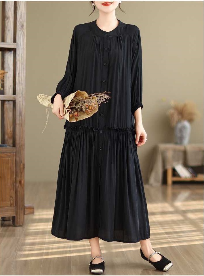 「同梱1万円送料無料」テロンとろん素材のお袖ぷっくりロング丈ワンピ★新品★大きいサイズ★黒のティアードワンピ秋 ブラック