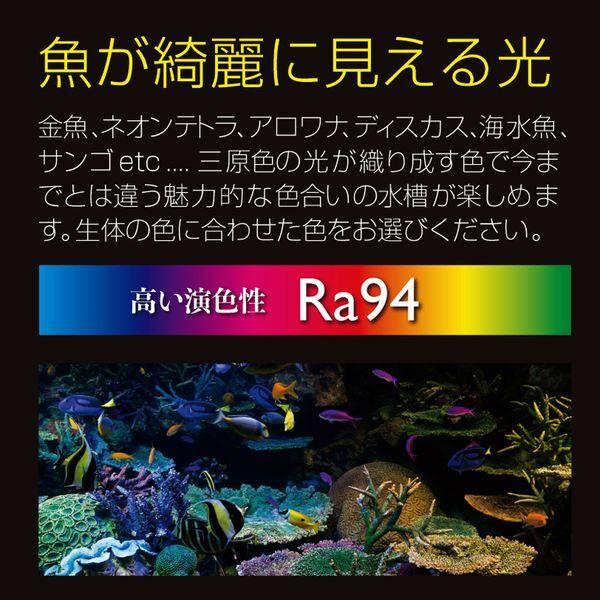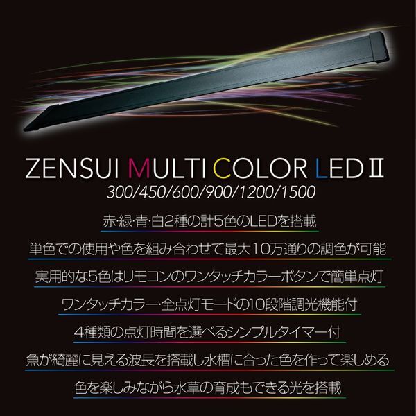 商品名:ゼンスイマルチカラーLEDII 450・赤、緑、青、白2種の5色のLEDを搭載・単色での使用はもちろん、組み合わせれば最大10万通りの調色が可能・実用的な5色はリモコンのワンタッチカラーボタンで簡単点灯・ワンタッチカラー全点灯モードの10段階調光機能付・4種類の点灯時間を選べるシンプルタイマー付■魚が綺麗に見える光金魚、ネオンテトラ、アロワナ、ディスカス、海水魚、サンゴetc・・・三原色の光が織り成す色で今までとは違う魅力的な色合いの水槽が楽しめます。生体の色に合わせた色をお選びください。■水草育成向きの波長水草の育成に効果的な光を含む波長域を搭載。水草育成に充分な光量もあり初心者の方でも魚の観賞と共に水草の育成を楽しめます。■商品仕様電圧全国共通サイズ:W450xD68xH24mm適合水槽:45cm水槽電源アダプター:入力AC100V、出力DC24V500mA周波数:50Hz/60Hz共用消費電力:18W(全灯MAX点灯時)色温度(ケルビン):7,000Kルーメン:MAX1,350lm演色性:Ra94IP規格:IP66 IEC規格(国際電気標準会議)
