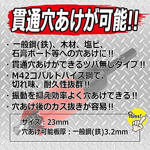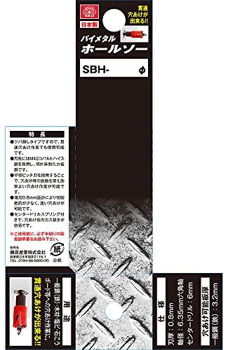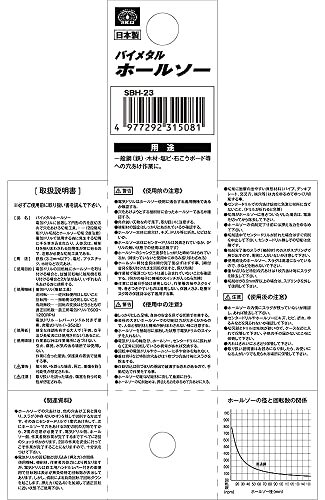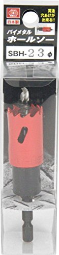 「SK11(エスケー11) バイメタルホールソー 23mm SBH-23 日本製」▼4977292315081▼(商品説明)インダストリアル・ 23mm SBH-23・・Size:23mm・用途:一般鋼(鉄)・木材・塩ビ・石膏ボード等への穴あけ作業・サイズ:23mm・穴あけ可能板厚:一般鋼(鉄)3.2mm・刃厚:0.8mm・軸径:10mm説明 貫通穴あけが可能。 ツバ無しタイプなので、貫通穴あけ作業でも使用可能。 刃先にはM42コバルトハイス鋼を採用し、切れ味、耐久性抜群。 不等ピッチ刃を採用することで、穴あけ時の振動を抑え効率よい穴あけ作業が可能。 薄刃0.8mm設計により切削抵抗が少なく、速い穴あけが可能。 センタードリルスプリング付で、穴あけ後のカス抜きが容易。 ※注意※ ご使用の際には注意事項をよく読んで、ケガのないように作業してください。