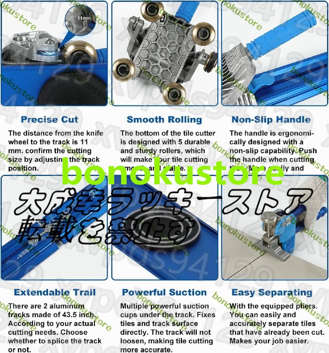2200-3800 ミリメートルタイルカッタースリムシステム大判タイル切断機手動岩スラブカッタープッシュナイフセット?特徴1.取り付け可能なガイドプレートを備えたハンドカットシステムを備えたポータブルタイル切断機。2.大型タイル、岩石スラブ、釉薬タイル、マーカータイルなどの手切断に特化しています。3. 最大 3.8 メートルの切断長さ、ランダムなスプライシング ガイドを使用して長さを変更できます。4. ガイドには吸盤が内蔵されており、正確な切断を保証します。5. アルミガイド、持ち運びが簡単。6.スムーズな切断を保証するために5つの耐摩耗性ローラーが組み込まれています。7.最大切断厚さは18mmまで。?仕様ボディ材質:: アルミニウム合金カット厚さ: 4-18mm長さ: 2.2/2.3/3/3.8メートル用途: タイル切断?パッケージリストカッターX1アルミトラックX2タイルペンチX1キャリングバッグ×1
