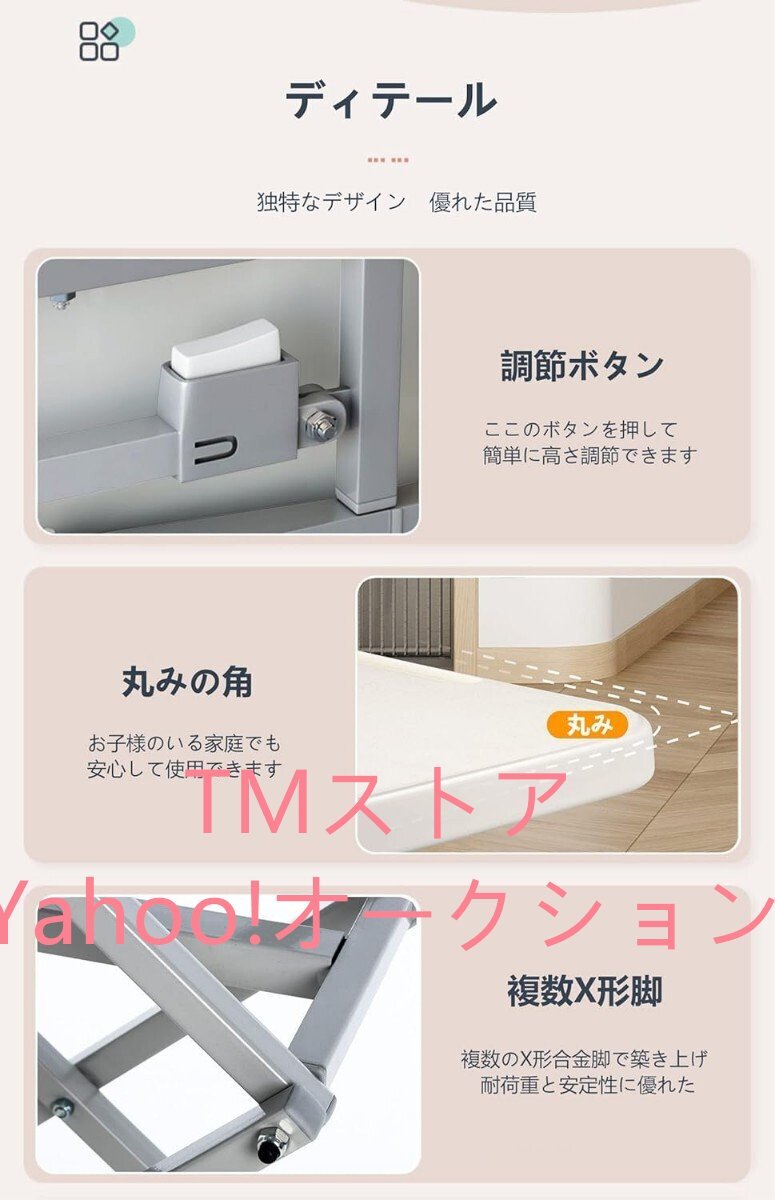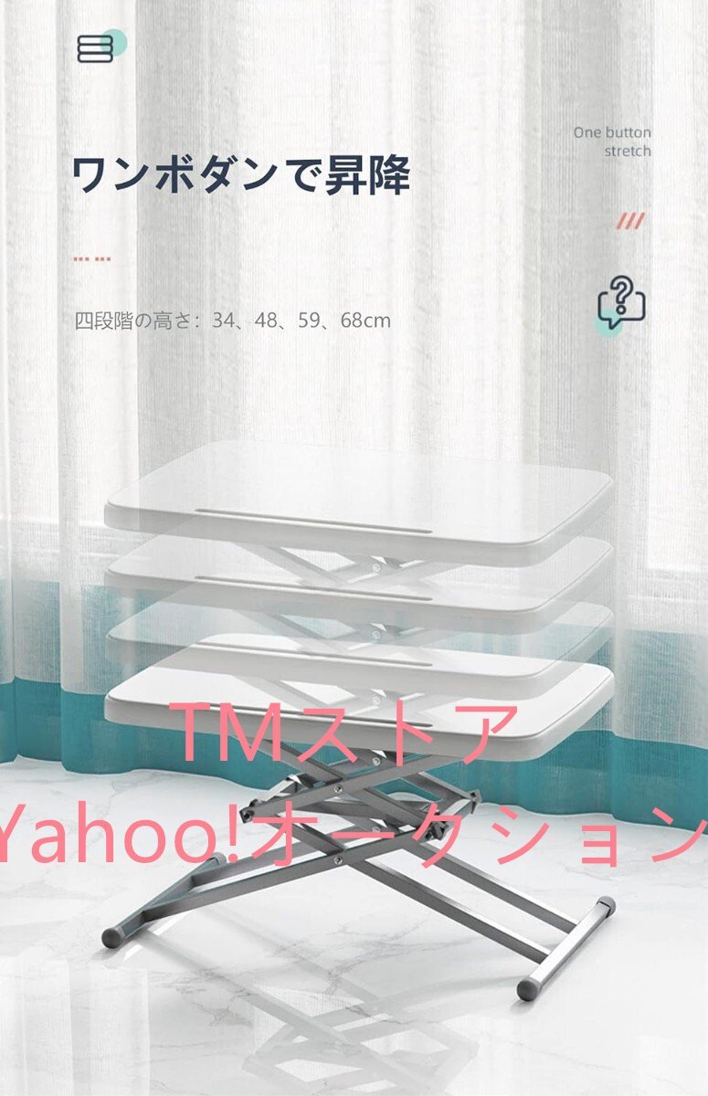 【自由に高さ調整】天板のサイズは長63cm x幅45cmで、4種類の高さを調節可能「34、48、59、68 cmに調節できます」。一番低くしたら、ローテーブルとして使用するだけでなく、このテーブルを他のテーブルの上に置いて、ノートパソコンのスタンディングデスクとしても問題なく使用できます。非常に便利で柔軟なテーブルです。