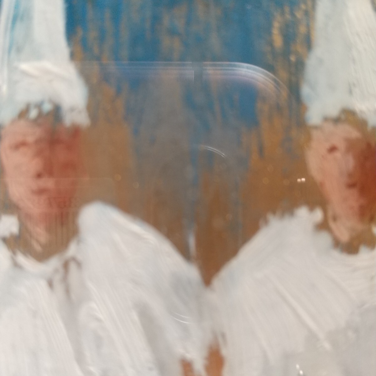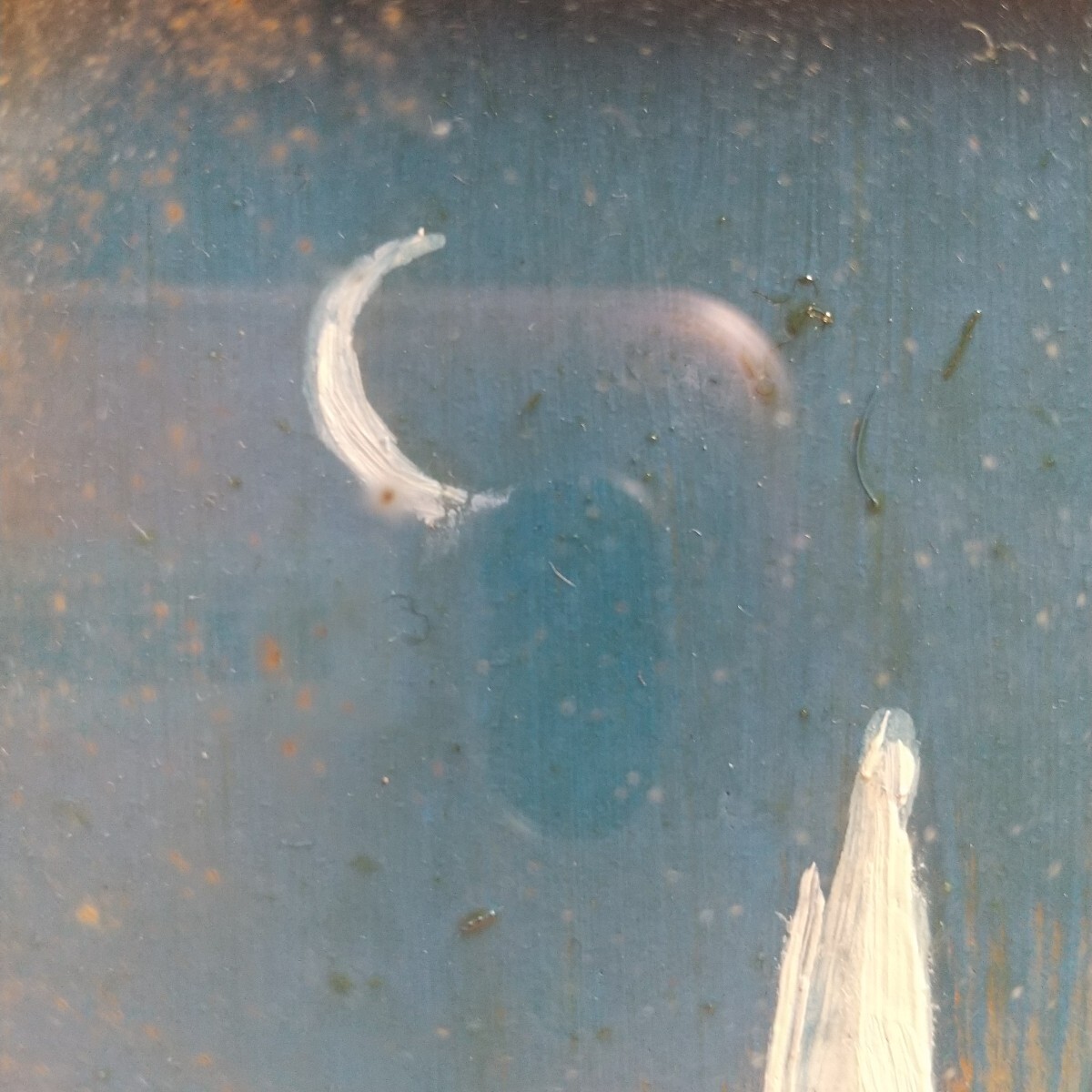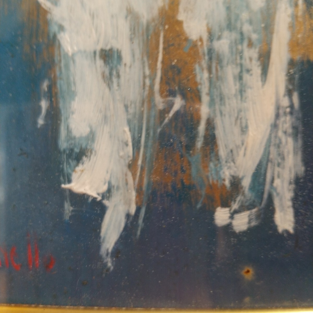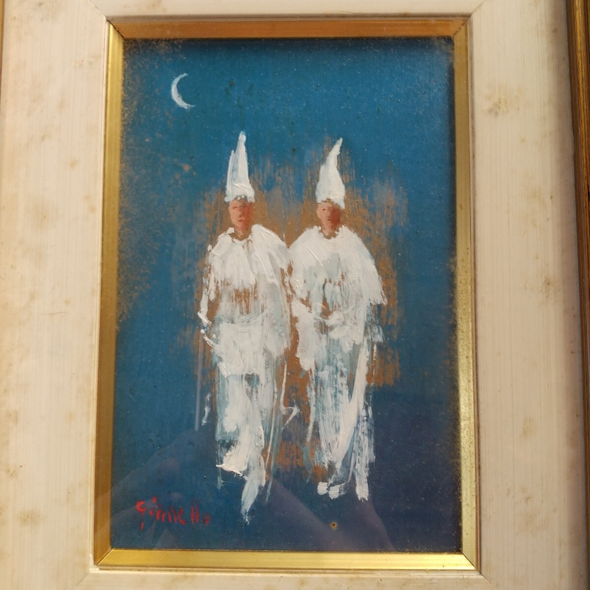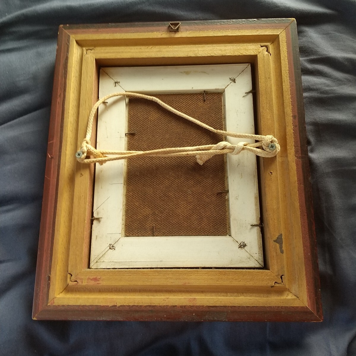 絵は綺麗な状態です。額は内側に保管染みが出ております。裏側は釘でしっかり留まっております。分解すれば綺麗になります。