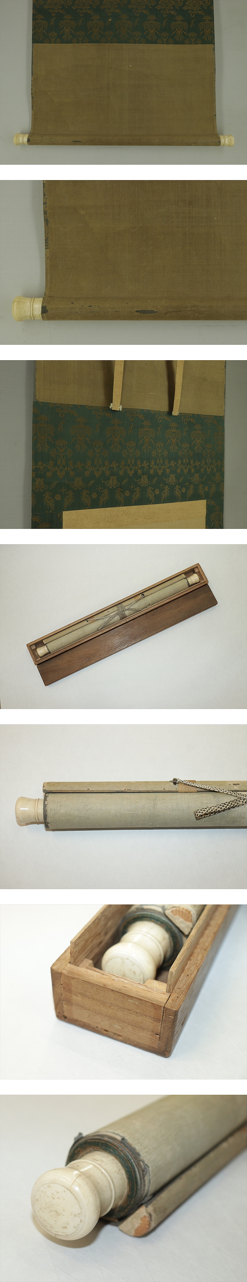 円山応挙 まるやま-おうきょ(1733-1795) 江戸後期の画家。円山派の祖。丹波生。 字は僊斎・仲選、号は一嘯・夏雲・仙嶺等、通称は主水。 石田幽汀に狩野派の画法を学び、幽汀の写生的画法に、宋・元画の技法を取り入れると共に、 西洋画の遠近法を研究して一家を成した。動植物の写生を最も能くする。 寛政7年(1795)歿、63才。 本紙は、染み、汚れ、折れ、皺、ヤケがあります。 表装は、染み、汚れ、折れ、皺、虫食、破れ、ほつれ、擦れ、剥がれ、ヤケ、 軸先に汚れと傷み、箱に傷みがあります。 【サイズ】 作品 横約32.5cm×縦約26cm 表装 横約44.5cm×縦約132cm |