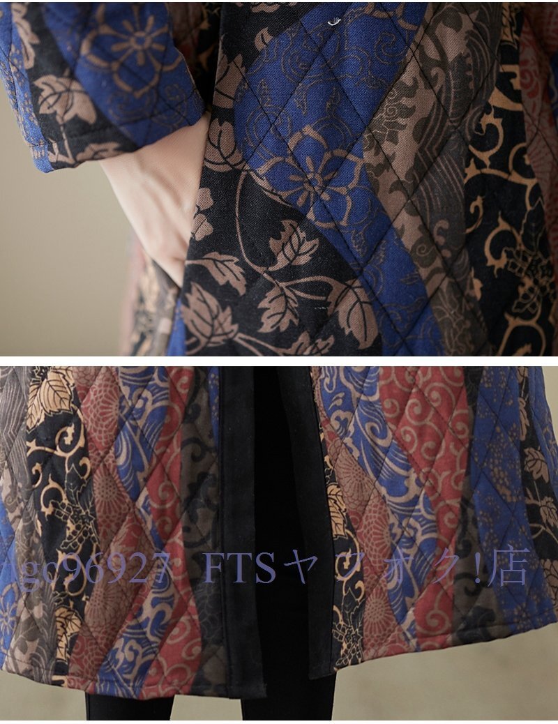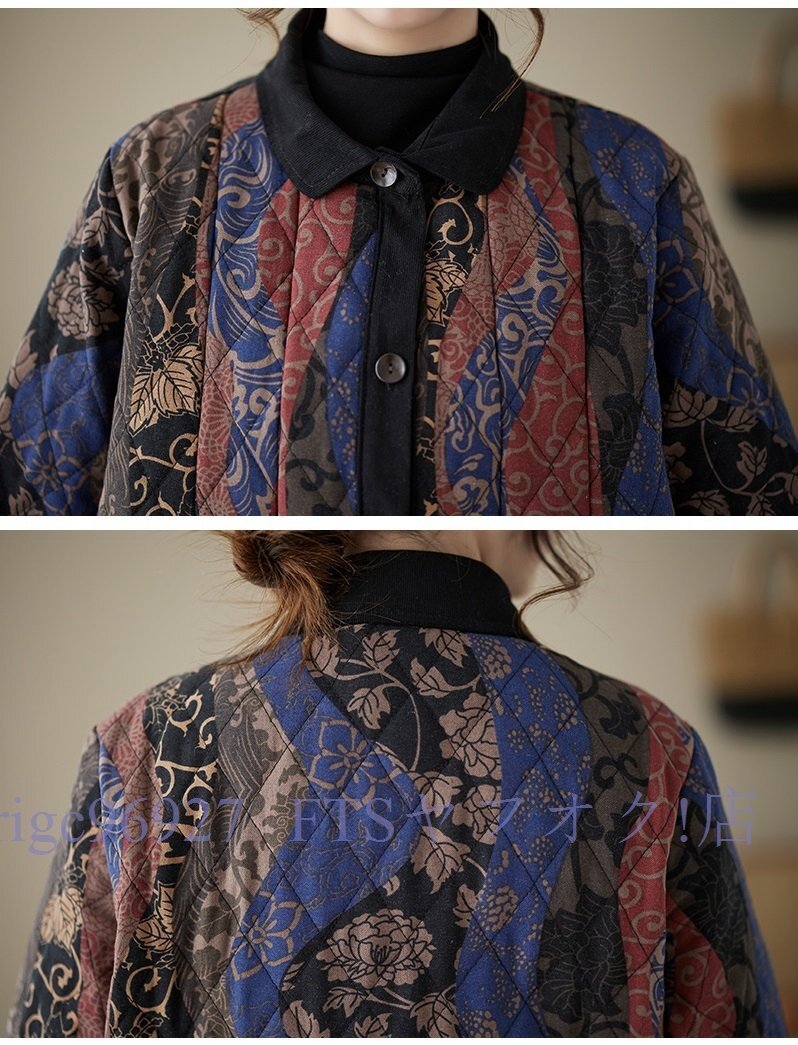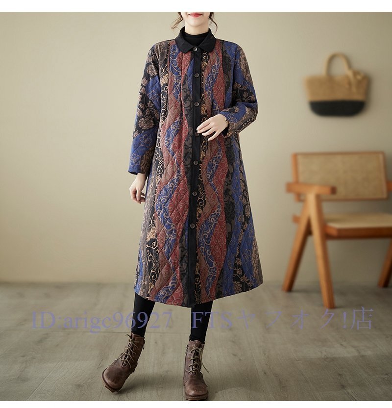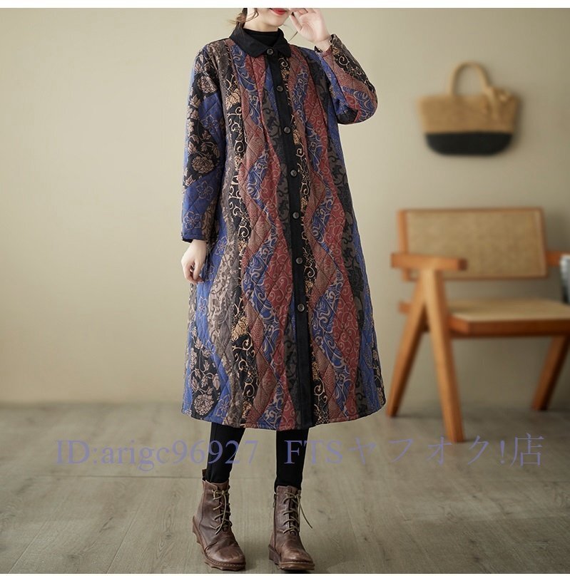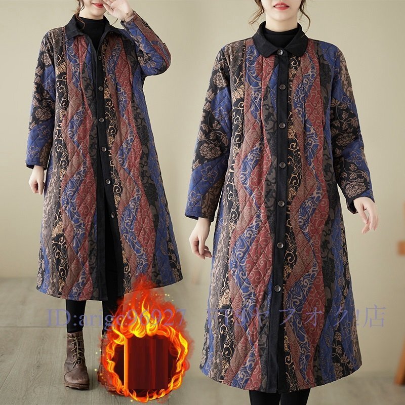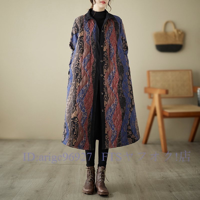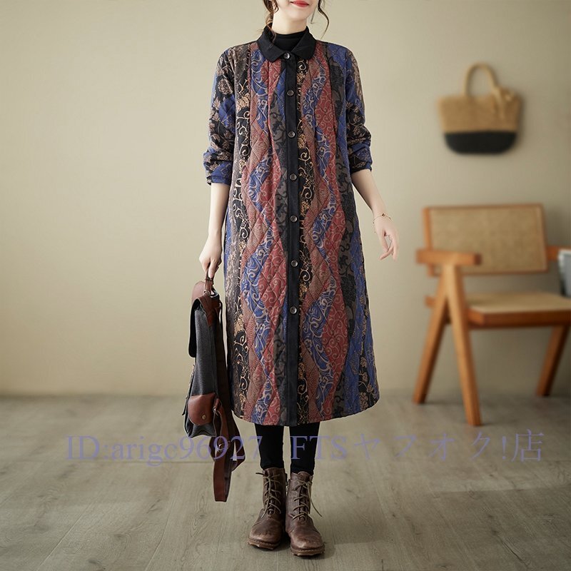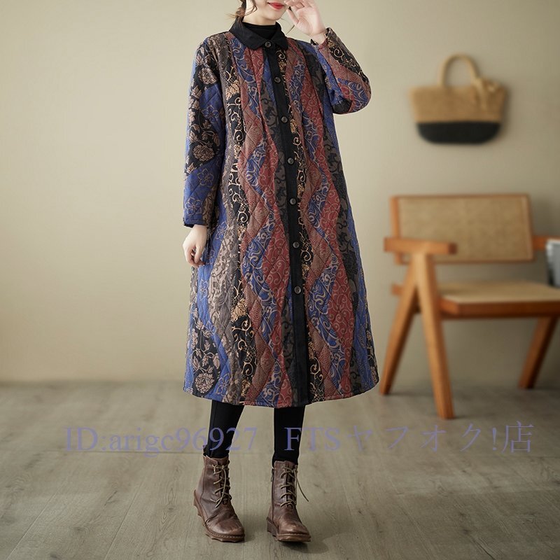 A6338☆新品秋冬 カジュアル ゆったり大きいサイズ 中綿 暖かい 復古 プリント柄 綿コート ロング丈コート M~3XL