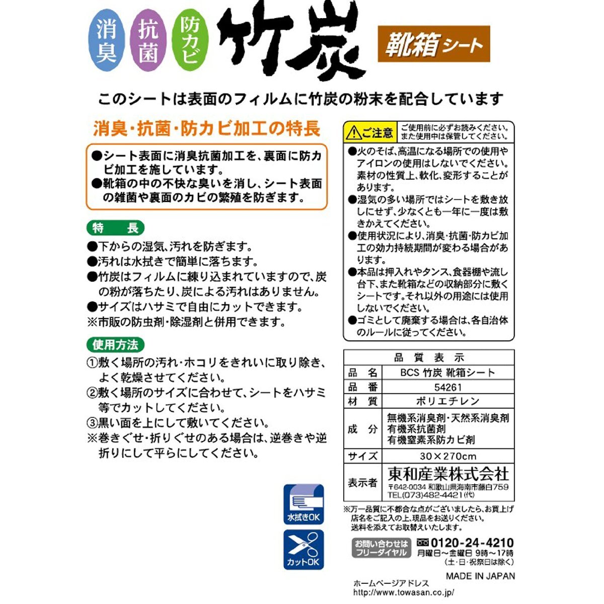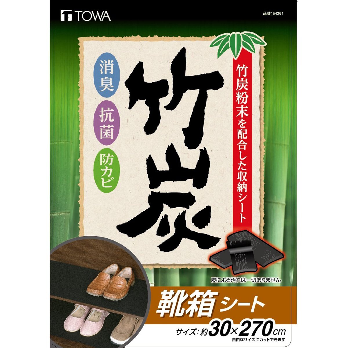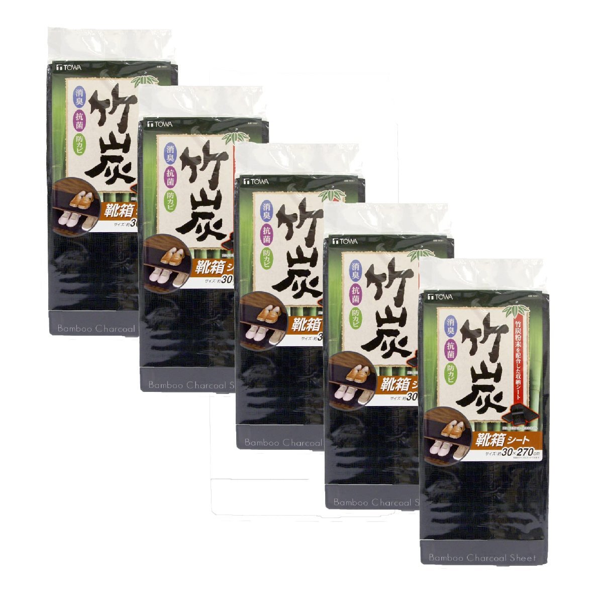 5個セット・ブラック 30×270cm 54261・Style:5個セット・本体サイズ:約30×270cm(1枚あたり)・本体重量:約40g(1枚あたり)・素材・材質:ポリエチレン・原産国:日本・セット内容:竹炭 靴箱シート×5個セット説明 ●竹の力で消臭効果と汚れの防止をダブルでかなえてくれる靴箱シートです。 ●梅雨に入る前や夏場のニオイ対策にもぴったりなアイテムです。 ●靴が好きな方や、お気に入りの靴をニオイから守りたい方に最適です。 ●黒色なので、ダーク系の靴箱に馴染み、汚れも目立たないのがうれしいです。 ●靴箱のサイズに合わせて、ハサミでカットできるので設置もかんたんに行えます。 ●ご自宅にはもちろん、宿泊施設や飲食店、病院などでの業務使いにもお使いいただけます。 ※用途以外には使用しないでください。ご注意表示をご確認の上ご使用ください。