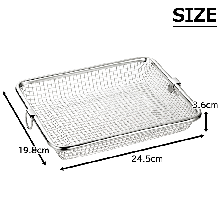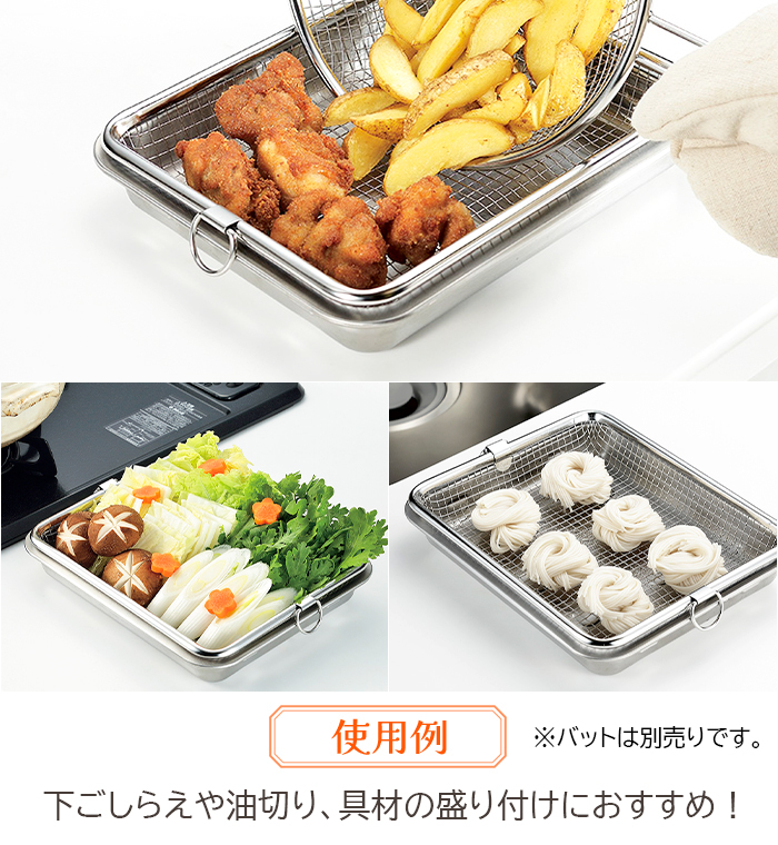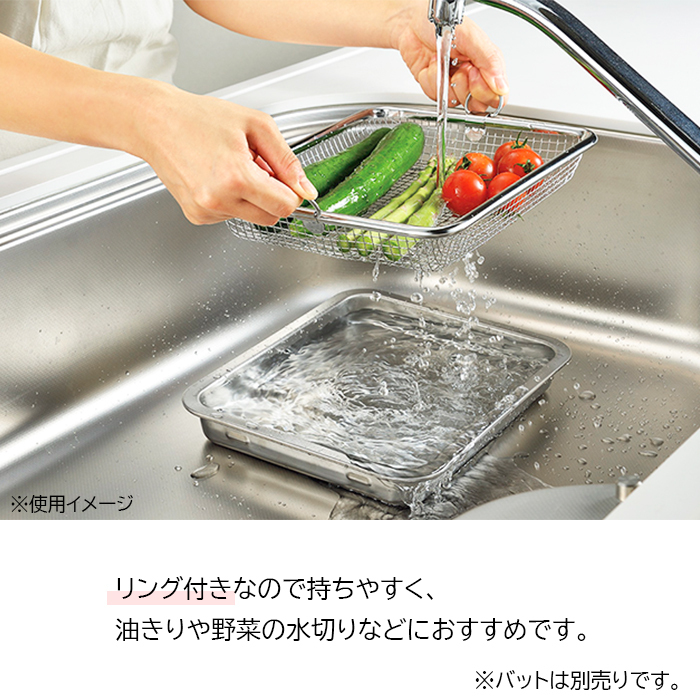 リング付きで油きりに便利。野菜の水切りなどにも使えます。