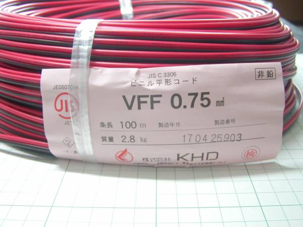 | 即決価格は 1mの価格です。 140円/m。 例えば、数量9で、9m 1本です。 【品 名】 VFF ビニール平形コード 定格電圧 300v 【メーカー】 株式会社KHD 【用 途】 可とう性、加工性に優れているので、電子工作、スピーカー配線に最適です。 【 サ イ ズ】 0.75sq-2c 赤/黒色、 定格電流 7A 【構 造】 導体 30本/0.18mm、 仕上外形 2.7mm x 5.4mm、重量≒29g/m 【切り売り】 1m ~ 9m 迄の切り売りです。 【価 格】 1m当たり 140円 --------------------------------------類似品------------------------------------- ◆この他に下記も出品しています。 ・ VFFコード 0.3sq-2c 赤/黒 1m~9m 80円/m(切り売り) ・ VFFコード 0.3sq-2c 赤/黒 10m 750円 ・ VFFコード 0.5sq-2c 赤/黒 1m~9m 100円/m(切り売り) ・ VFFコード 0.5sq-2c 赤/黒 10m 950円 ・ VFFコード 0.75sq-2c 赤/黒 1m~9m 140円/m(切り売り) ・ VFFコード 0.75sq-2c 赤/黒 10m 1,350円 ◆ほかにも多数、出品しております、下記より分類毎に検索出来ます。 ------------------------- 検索キー ------- rev. 2024/09/10------------------- カーボン抵抗 セメント抵抗 可変抵抗 電解コンデンサー 積層セラミック インダクター センサー 集積回路・TR ダイオード 発光ダイオード 拡散キャップ 電池ボックス プリント基板 端子台 コネクター スイッチ 測定器 電源関係 放熱器・FAN 電線 保護部品 USB関係 LiPo関係 照明関係 その他 熱収縮チューブ ⇒25cm 物 ⇒1m 物 ⇒割安 RC関係 中古品 送料無料品 休業日 | |