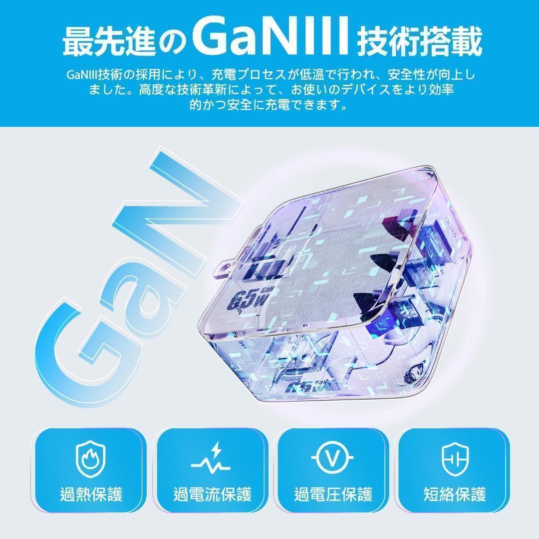 【スマートな充電保護、各設備を安心して守護】PD65W充電器は、先進のGaNIII(窒化ガリウム)材料と「3Dチップスタッキング技術」を駆使しています。この特殊な組み合わせにより、充電器はコンパクトながらも非常に効率的な電力変換が可能で、内部の熱を最小限に抑えながらも高いエネルギー効率を提供します。更に、進化した「3Dチップスタッキング技術」により、わずかなスペースに多くの機能を組み込み、PD65W充電器は過電流、過電圧、過熱などの問題から包括的にデバイスを保護し、高い充電効率と信頼性を実現しています。