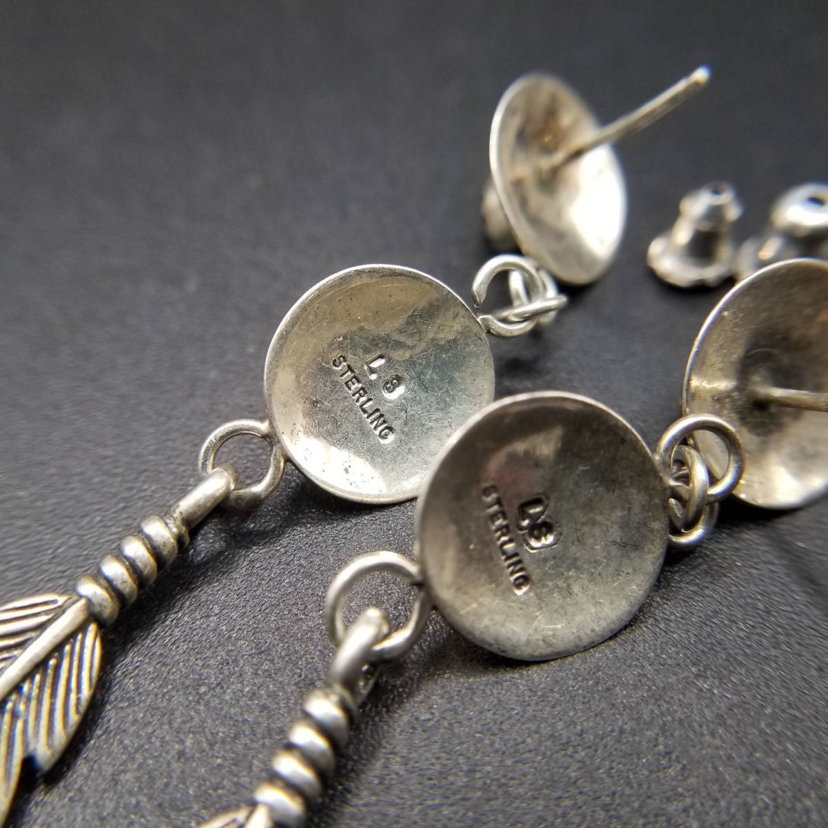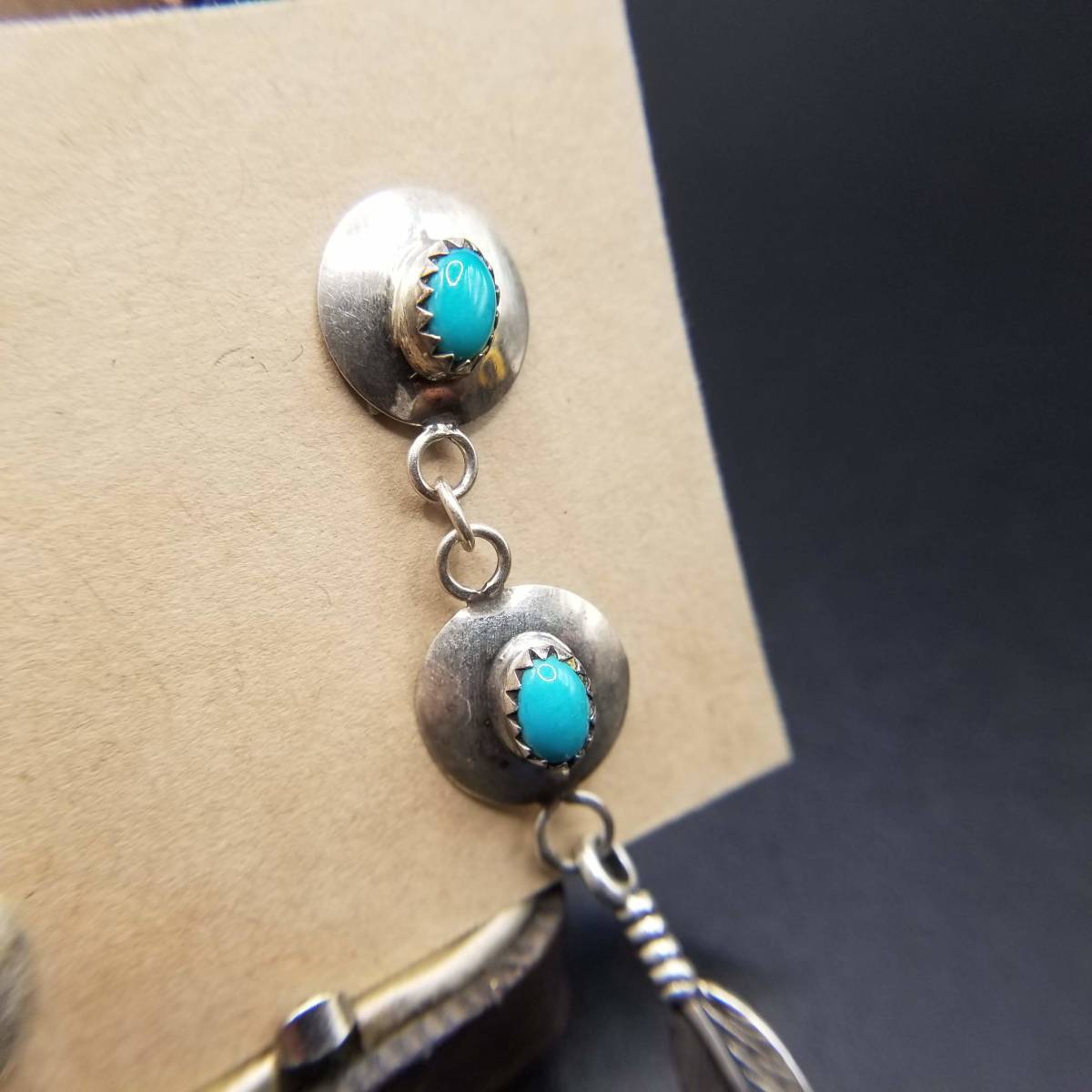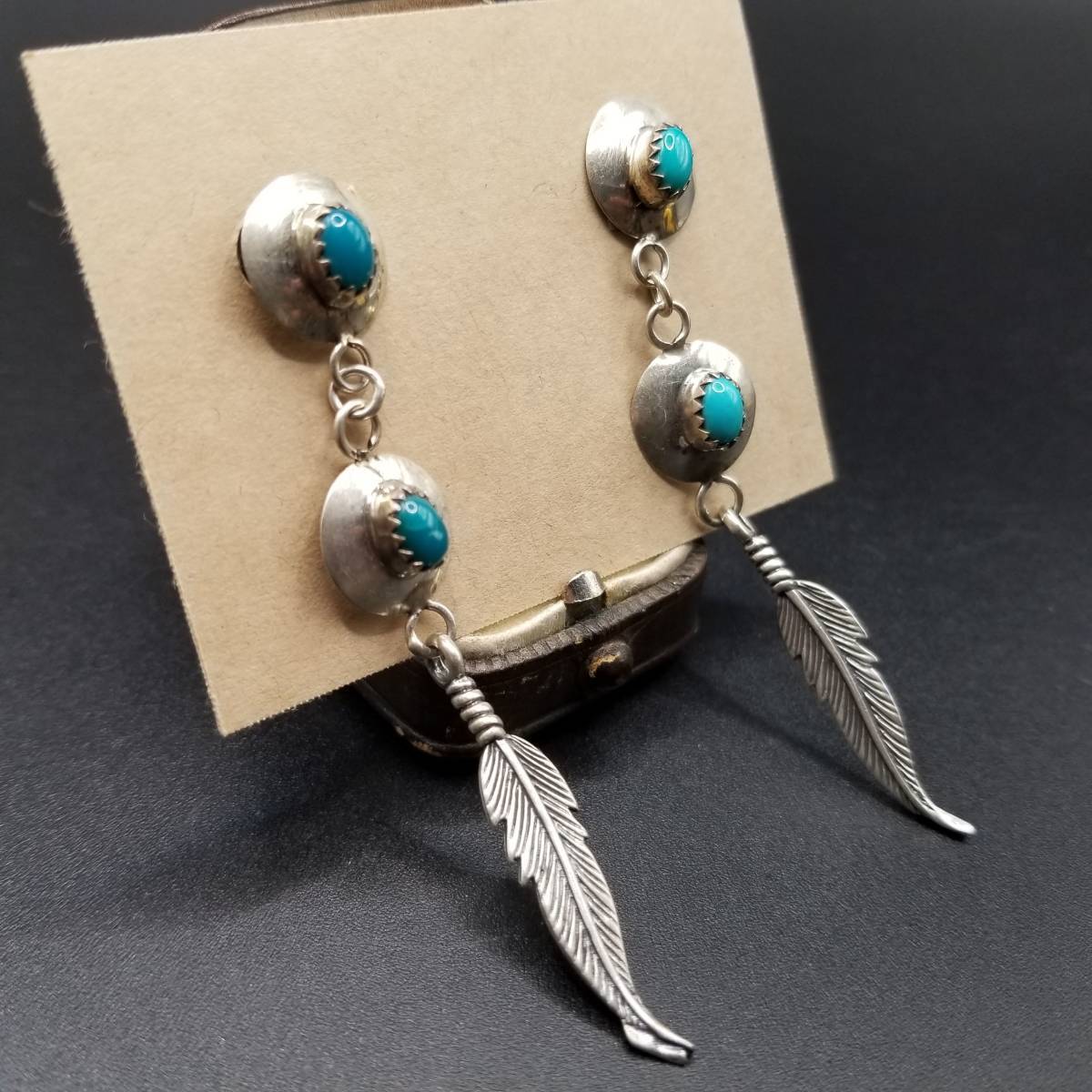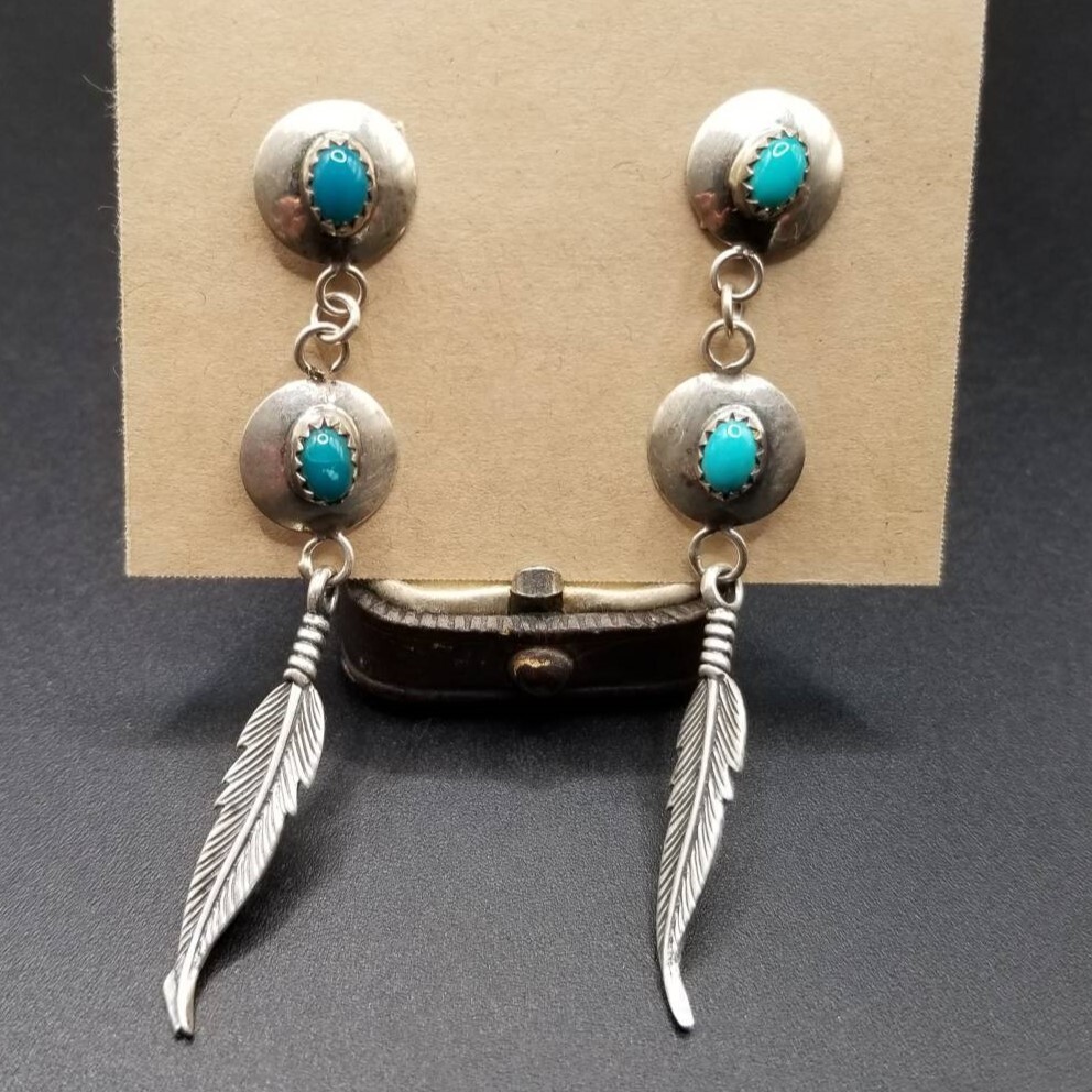 インディアンジュエリー ナバホ族 Larry Sandoval 925 シルバー ヴィンテージ ロング ピアス ターコイズ 羽 装飾 チャーム NAVAJO YMO