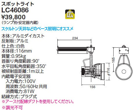 【仕様】 ●本体:アルミダイカスト ●反射板:アルミ ●仕上色:白色 ●本体径:116mm ●質量:0.95kg ●首振り角度範囲:90° ●水平回転角度範囲:350° ●被照射面距離:1m以上 ●内蔵電子安定器 入力電力:100V 周波数:50/60Hz共用 消費電力:81W ●結線方法:プラグ式 |