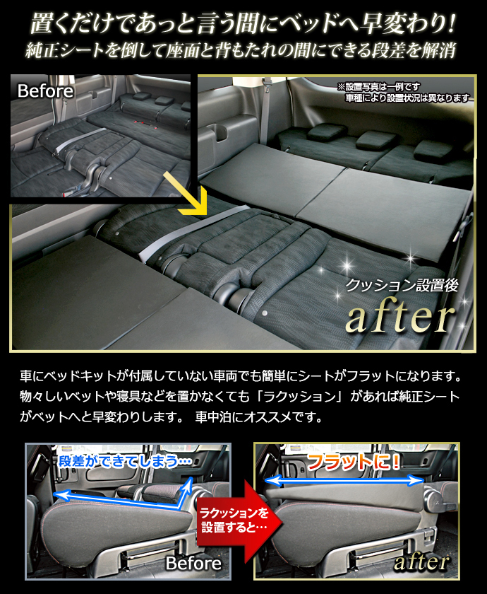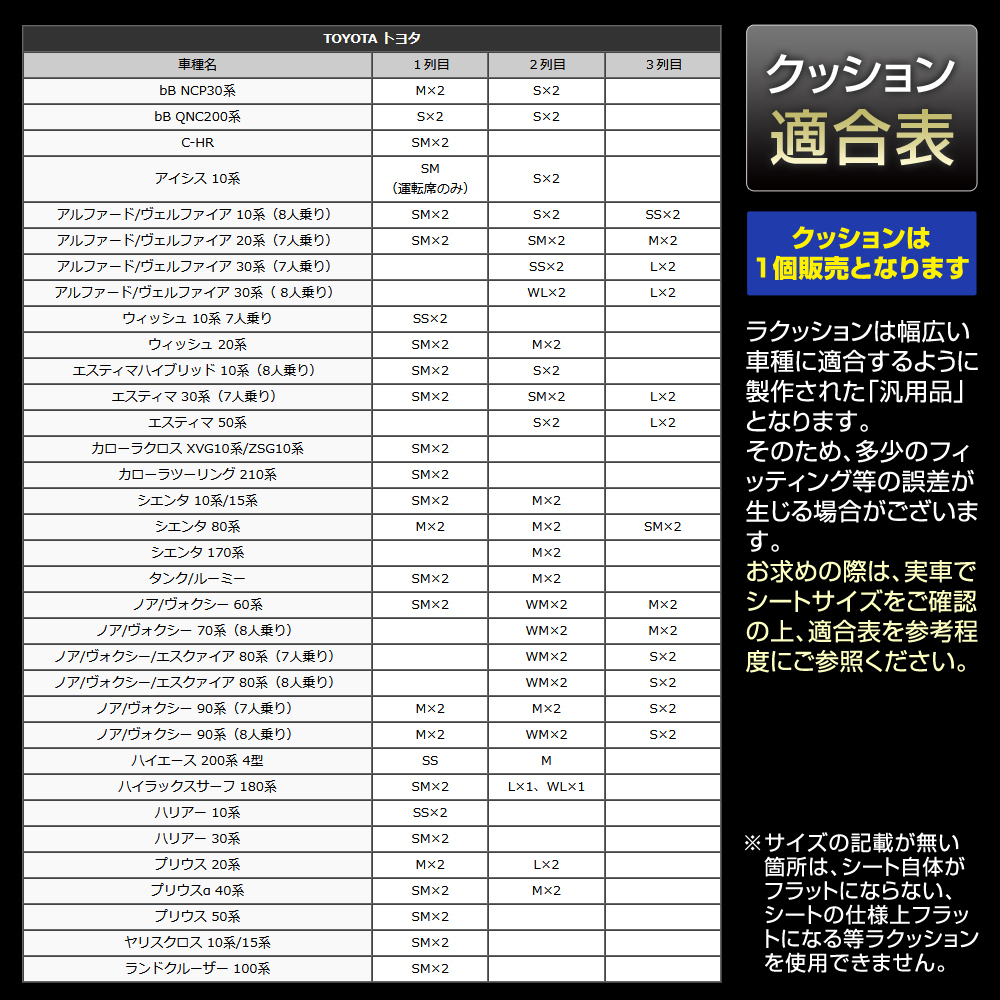 ※適合表データは、スタッフが独自にクッションを当て合わせて調査したデータです。適合表はあくまで参考程度にご覧いただき、実車にてサイズ確認を行った上でお求めください。なお、当製品は汎用品につき、装着方法など装着に関するご回答はできかねますので予め実車にて確認等を行ってからお求めください。
