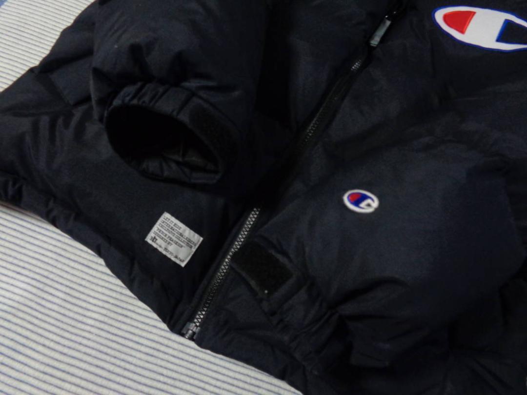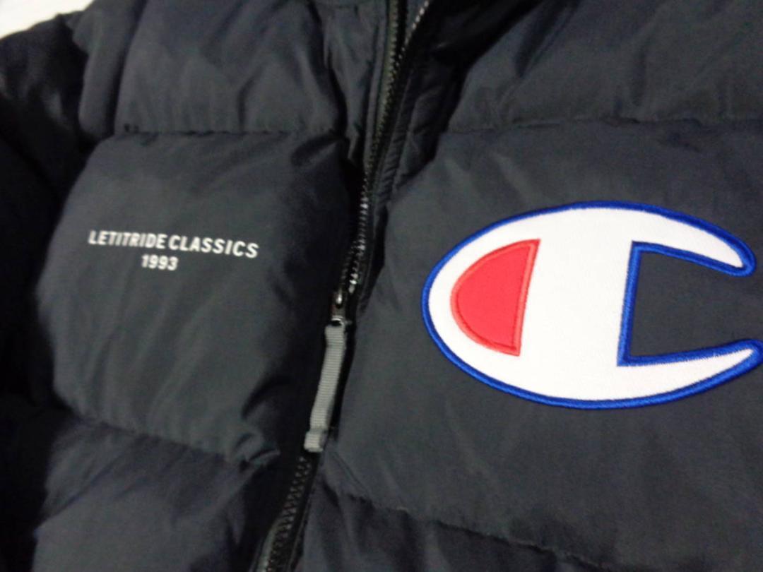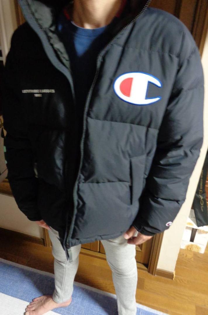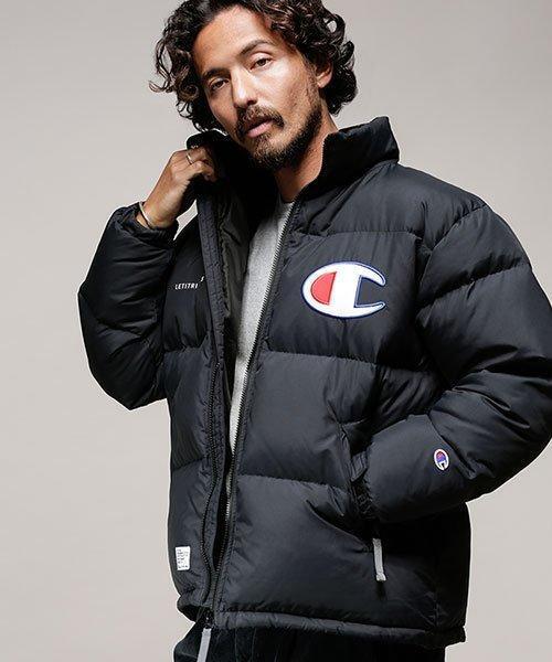 フロントに配したチャンピオンCマークのロゴワッペンが存在感あるダウンジャケット。