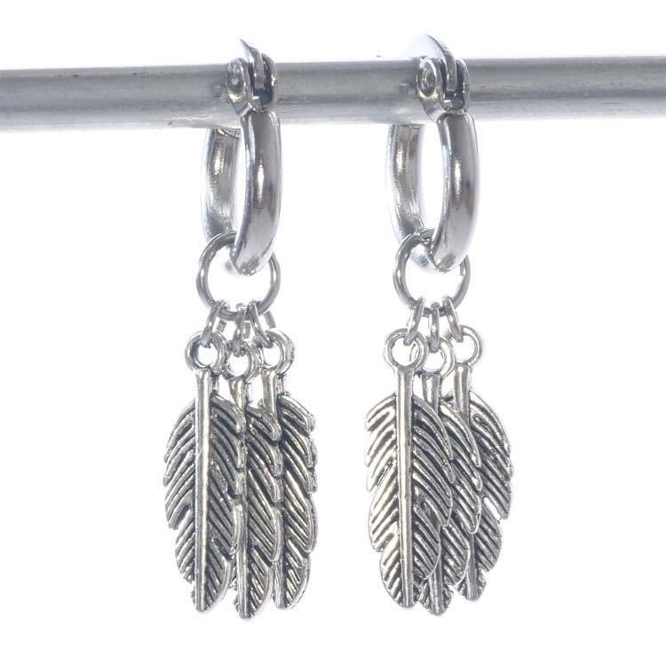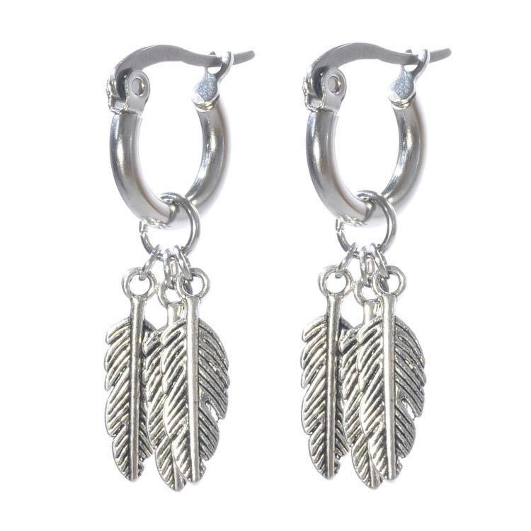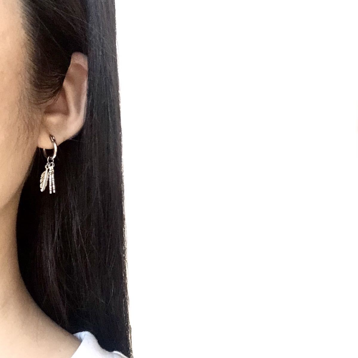動くたびに揺れる、小さな3つのフェザーチャームが魅力のフープピアスです。お肌に優しいサージカルステンレス製で、アレルギーなども起こしにくいお品です。