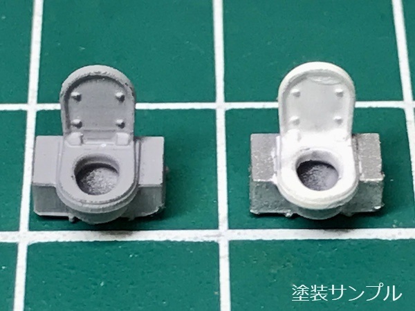 車内にあるトイレを表現するパーツです。 取り付けても外からは見えませんが、そこにこそ拘りたい方には最適なパーツです。 未着色のため塗装してご利用下さい。 和式便器や男性用便器、洗面台も販売中です。 3Dプリンタ製でForm3用スタンダードレジンで出力されております。 ※商品パッケージは一部異なる場合がございます。 | 使用方法 |