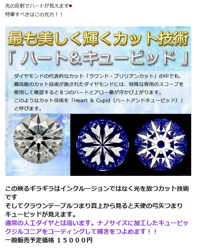 ![]() 色 ダイヤモンドカラー(透明) 6.5mm ダイヤ1ct相当の大きさです。 ダイヤモンドでいうキューレットつまり真下から見る アングルだと光の反射でハートが見えます 特筆すべきはこの光方 天然ダイヤより輝きが優れております。 特筆すべきはこの光方!! この映るギラギラはインクルージョンではなく 光を放つカット技術にあるんです!! 通常の人工ダイヤとは違います。 ナノサイズに加工した人工ダイアモンドをコーティングして 輝きをつよめます。これらはダイヤモンドの世界では 高品質のものしか見れないものです。 参考価格18000円。 | ||||||