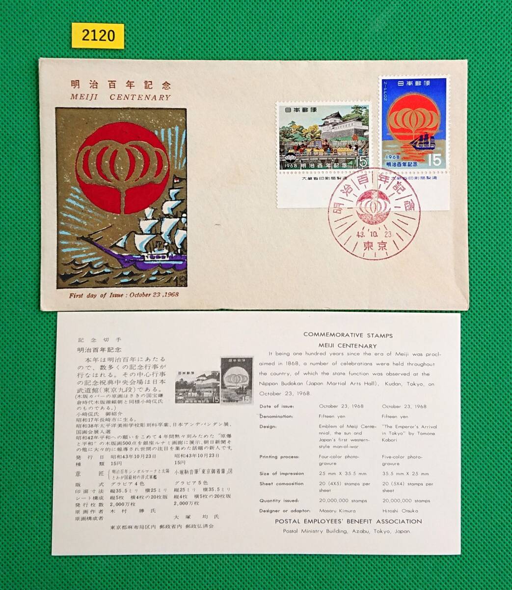 FDC/明治百年/銘版付/初日印/東京記念印/郵政弘済会/解説書有り/1968年10月23日/初日カバー №2120