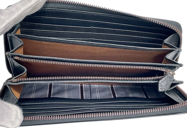 コメント・・・ブラックレザーにアンティークな雰囲気をイメージできるオーブをデザインした長財布です。内側のストライプ部分はメンズシャツの生地を使い、アンティークショップにある様なイメージのオシャレなお品です。