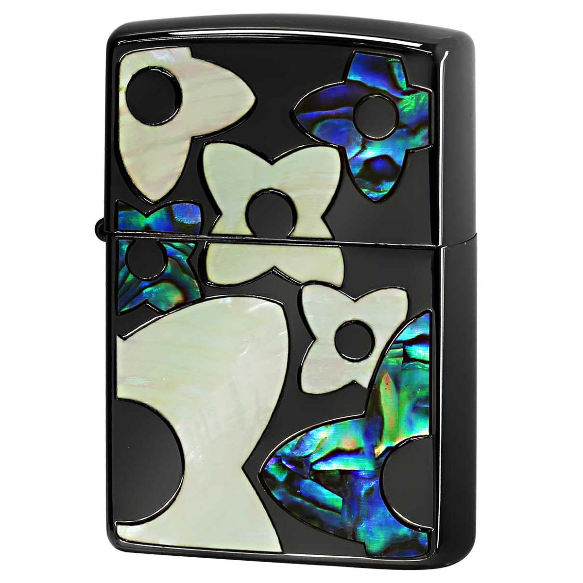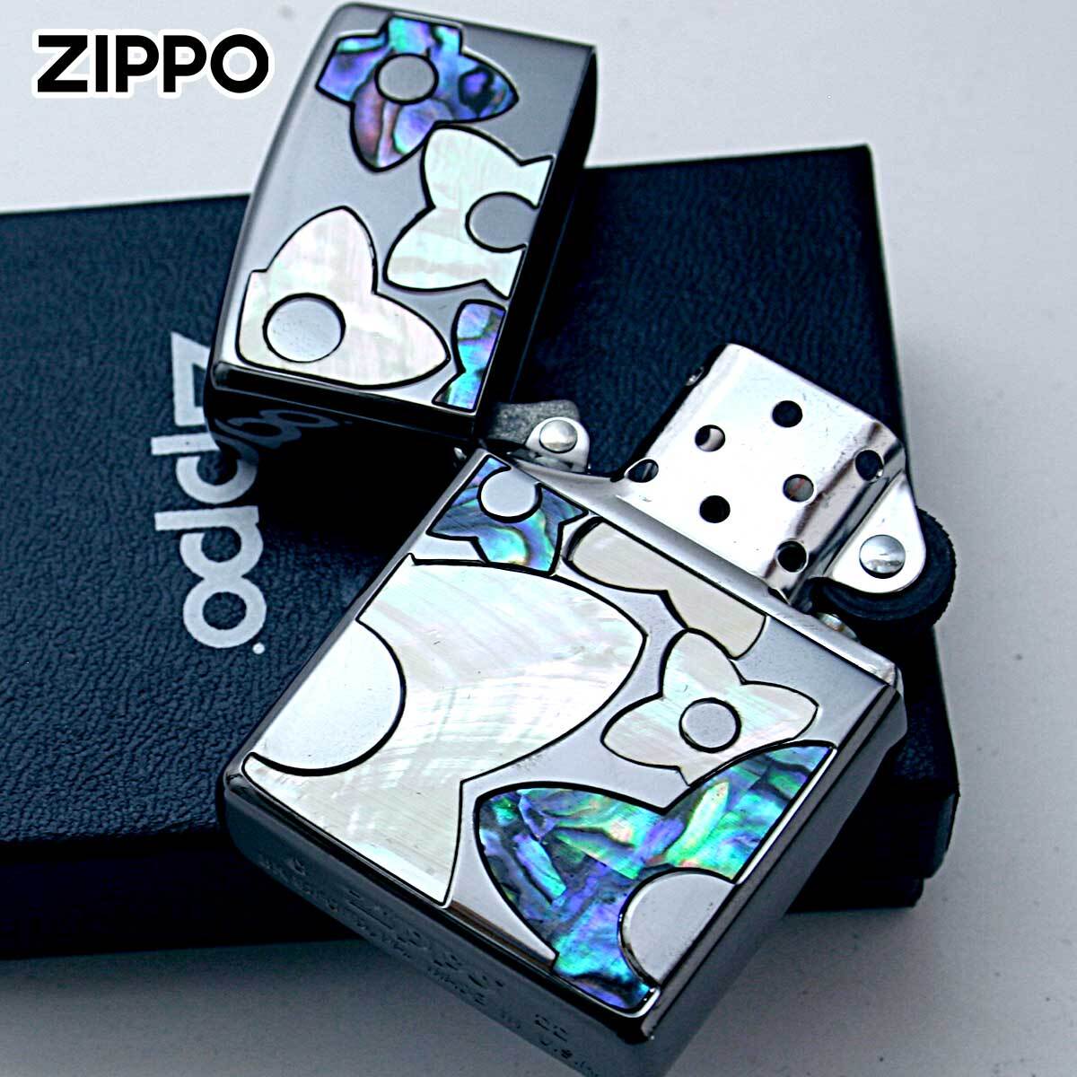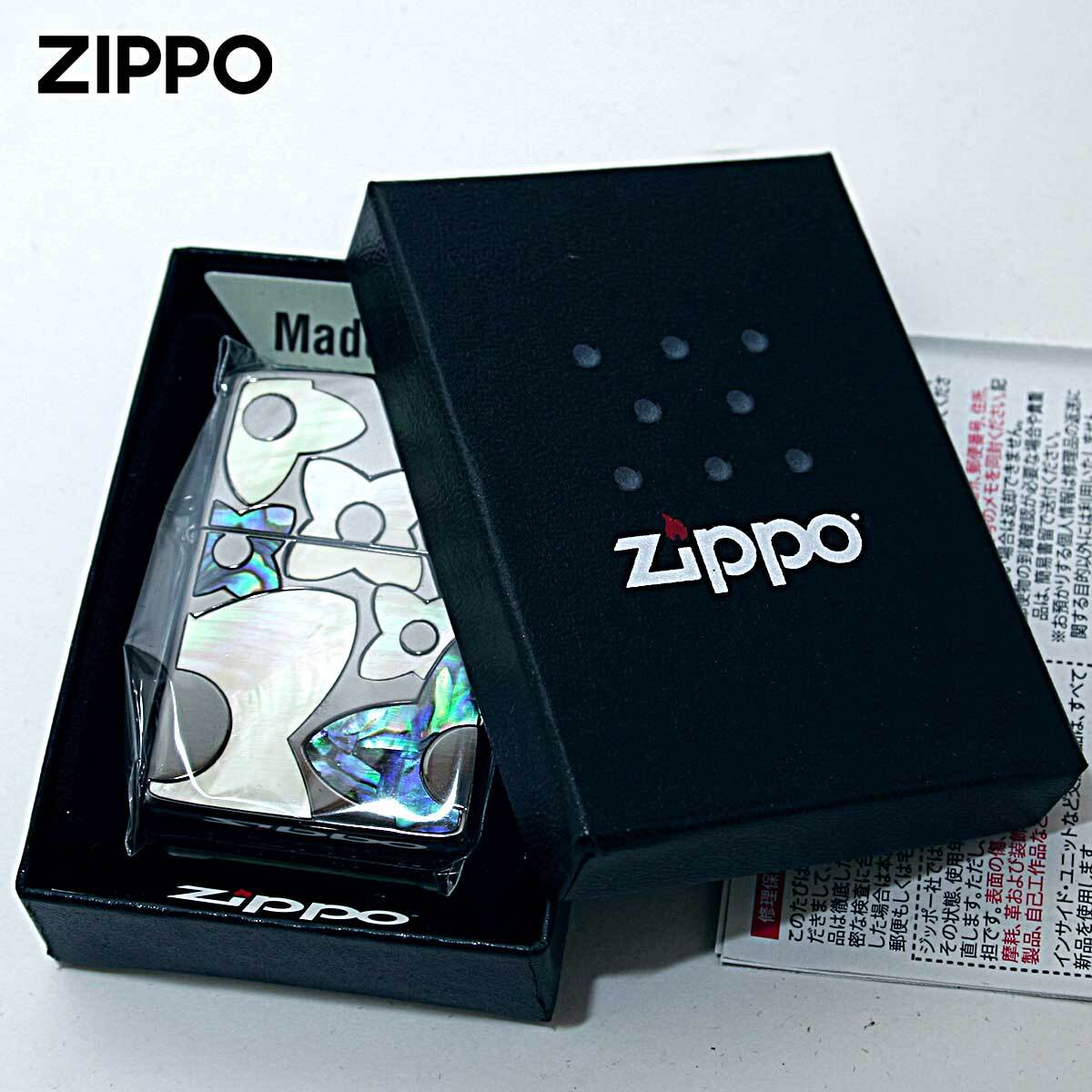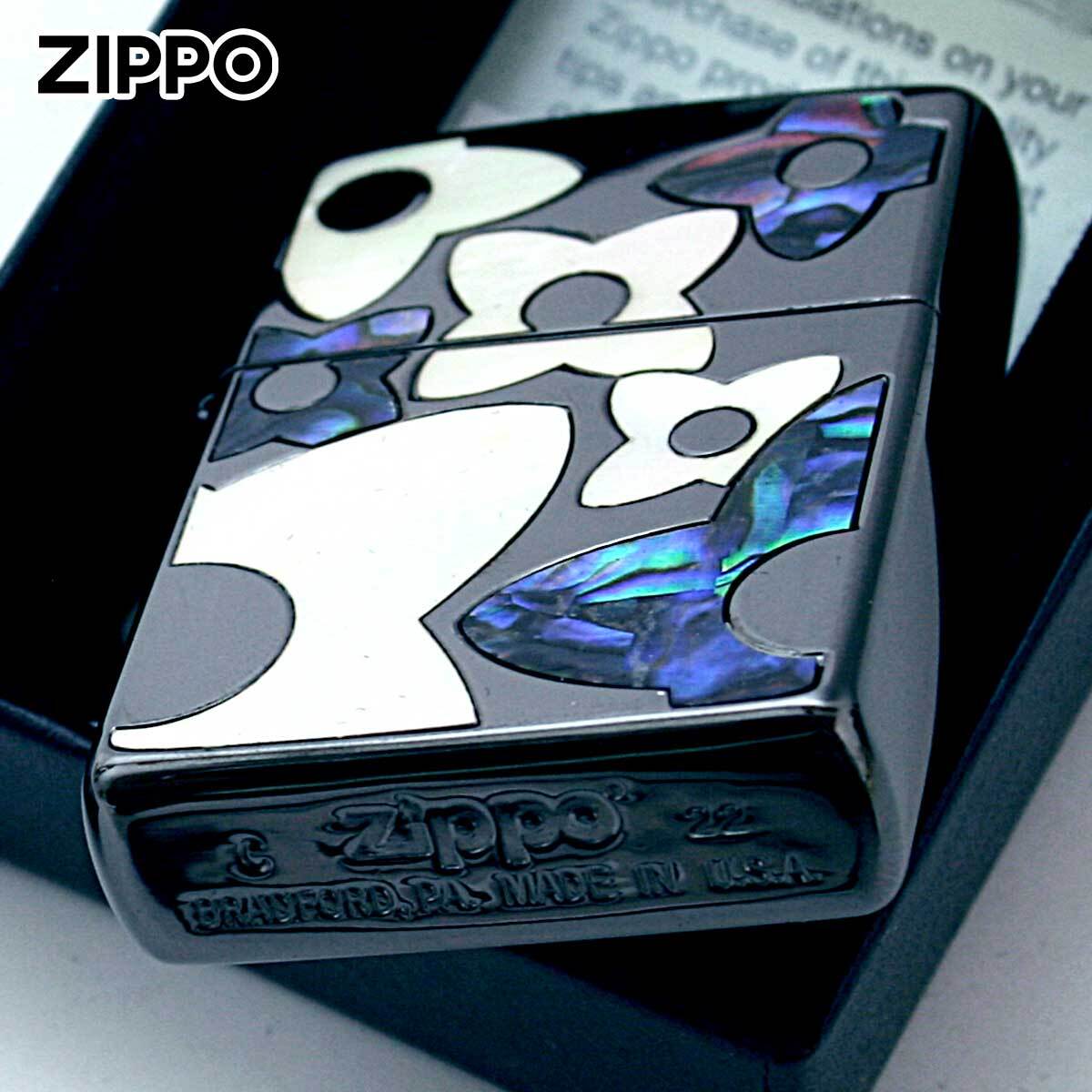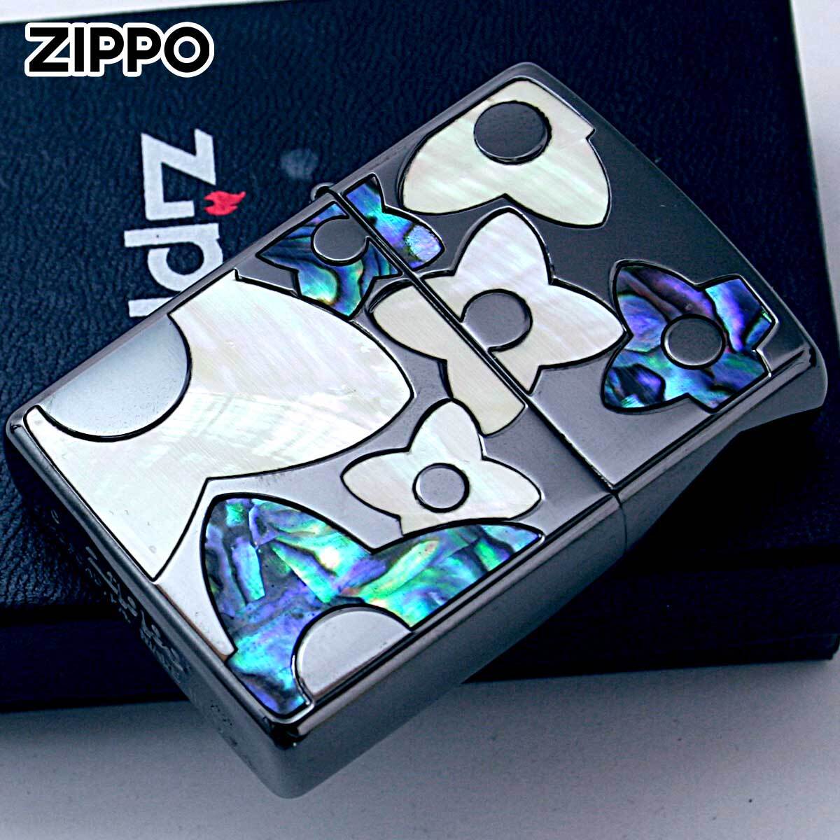 花柄のシェルを埋め込んだ可愛らしいZIPPO。この技法はインレイ(象嵌)と言い、土台となる素材に別種の素材を埋め込んで模様を描く装飾技法です。シェルも異なる2つの色味を用意。女性への贈り物にオススメ!