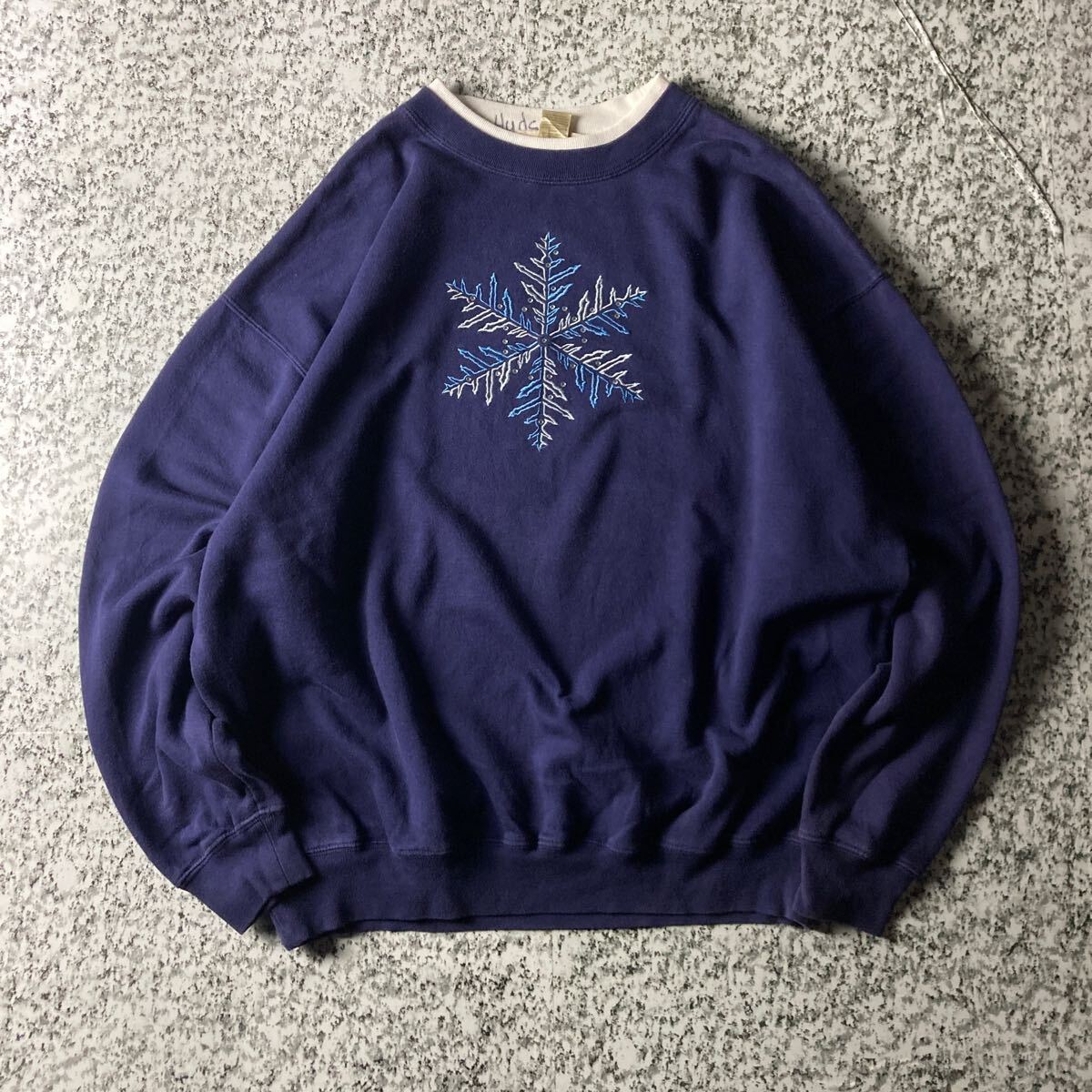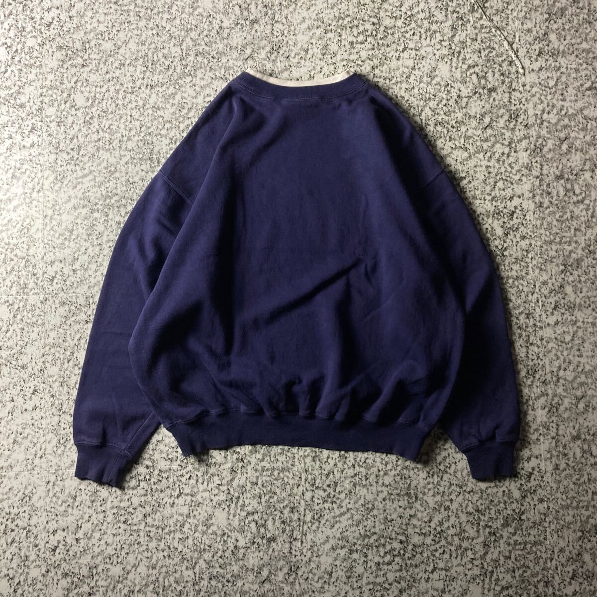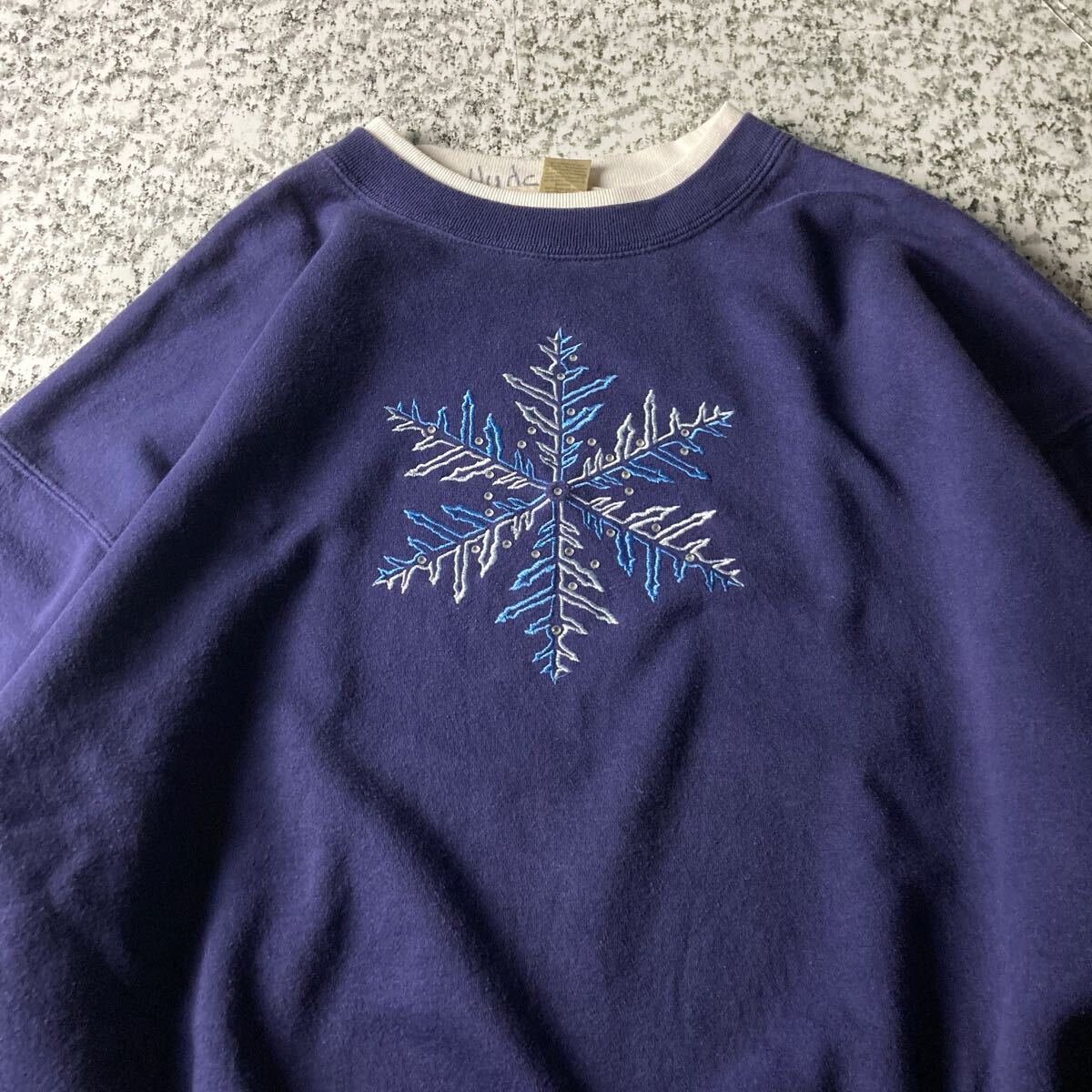 【90sオールド】結晶 ラインストーン Wネック レディーススウェット 古着 ネイビー Lサイズ ヴィンテージ トレーナー