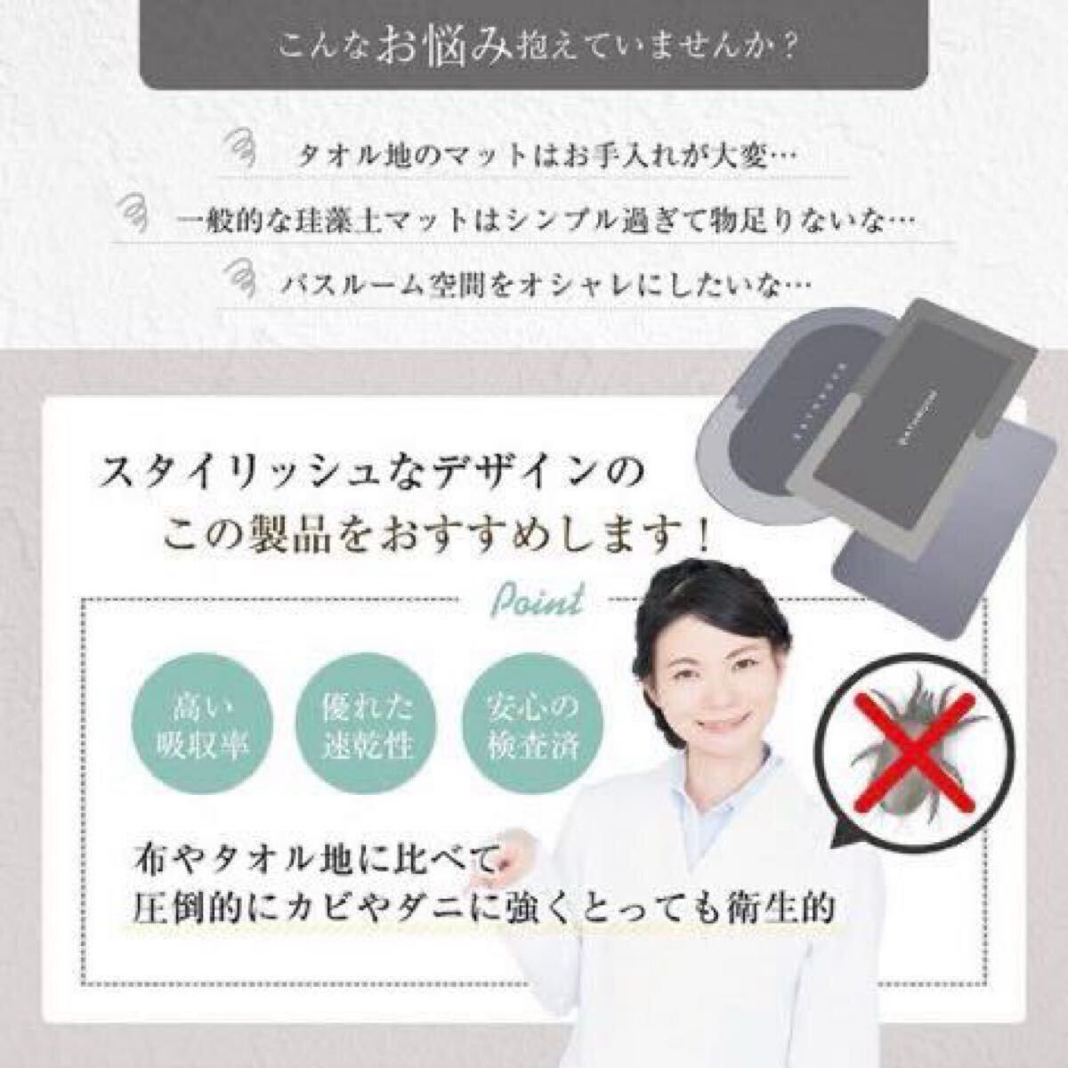 水分を放出する珪藻土バスマットは、カビやダニにも強い。