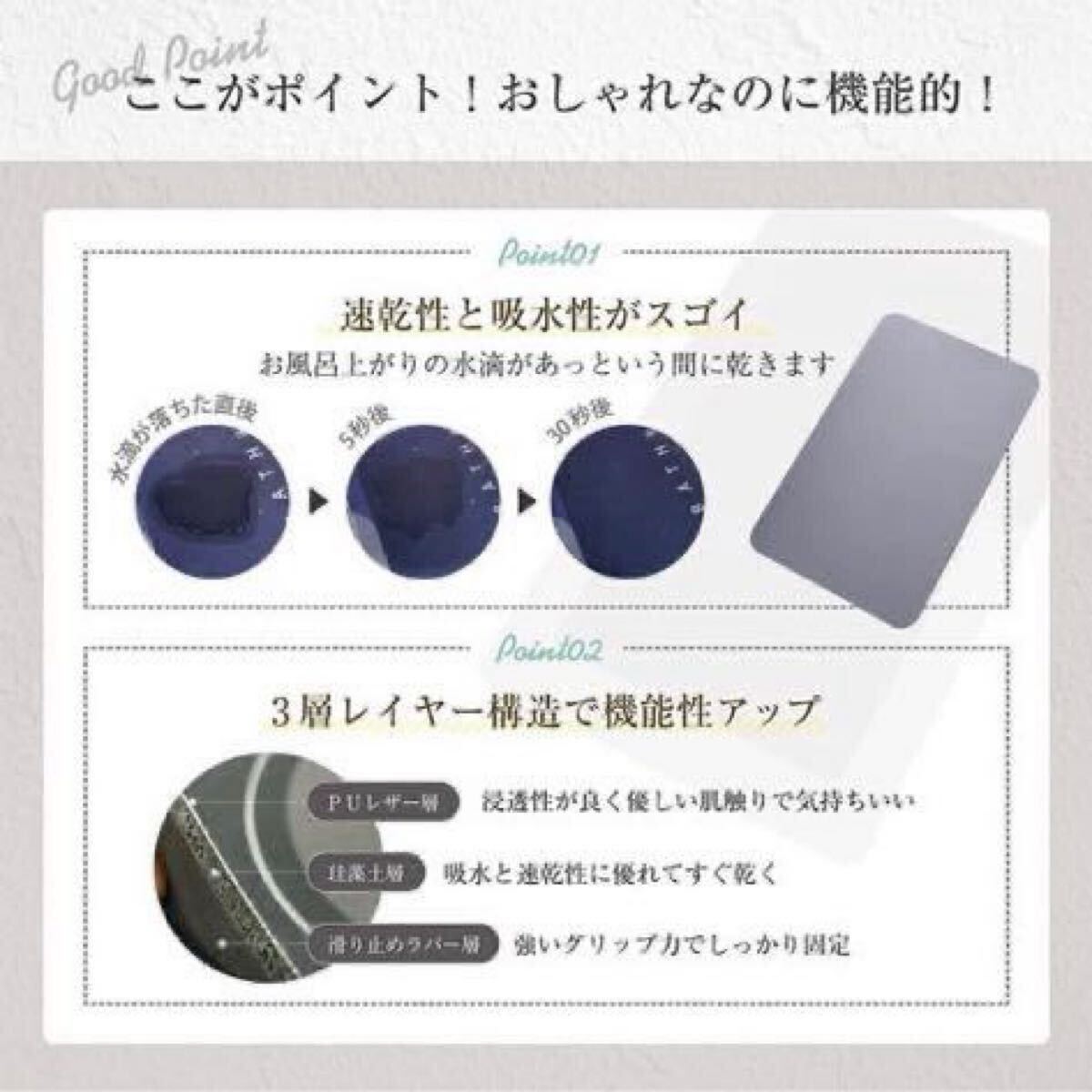 お風呂から出る際に足元の水気を速やかに吸い取ります。