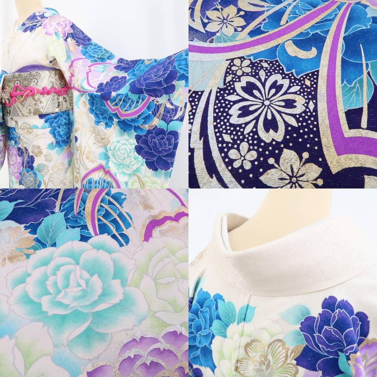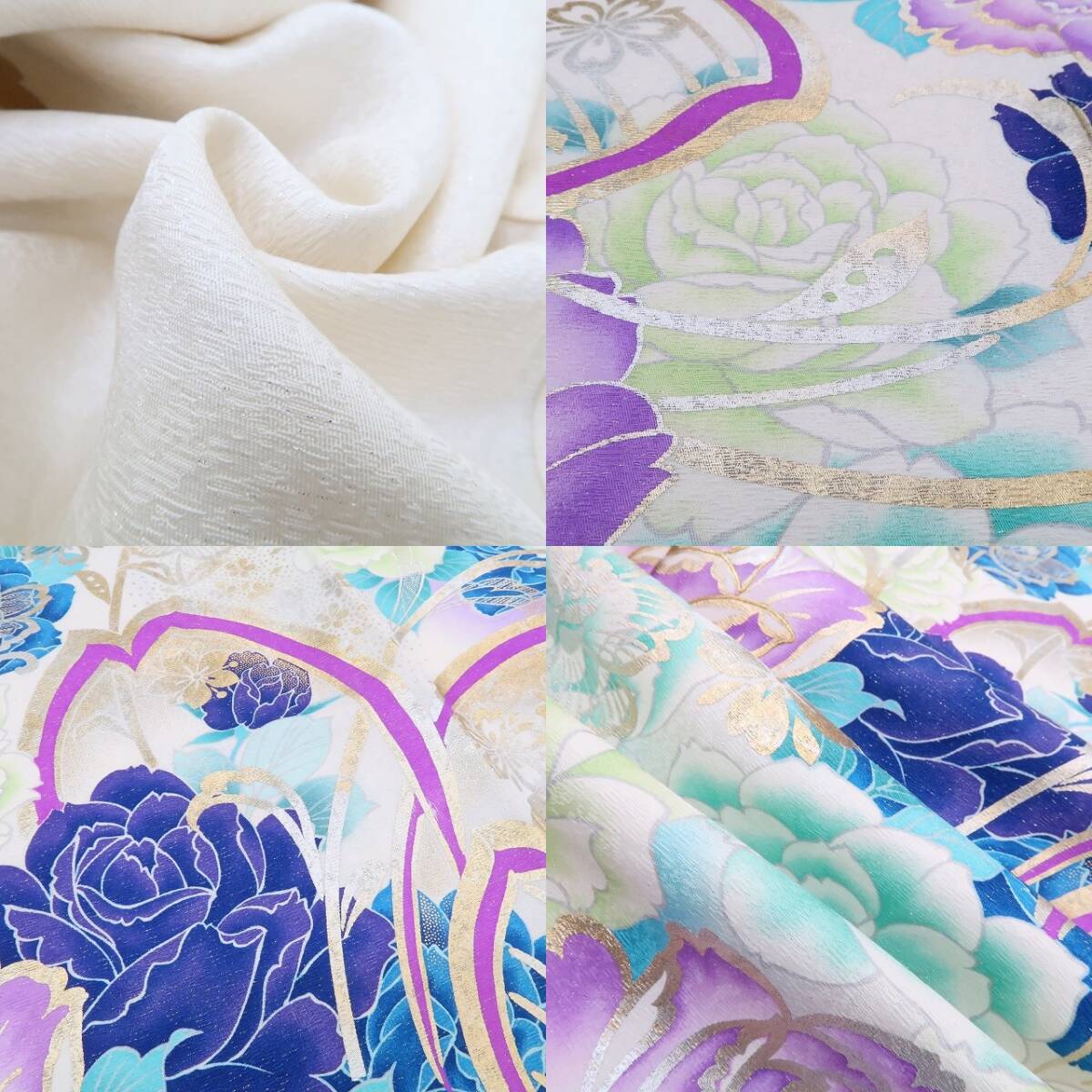 上品な生成り色に銀色の巧みな美しさを輝かせて棘を持たずに気品溢れる美しさとそれぞれの色と色を風に預けて金色の晴れ化粧や桜の友を連れ、一斉に揺らめき、まるで袖を通す貴女に大きな大きな花束を贈るかのような薔薇たちにうっとり...薔薇“銀通し”成人式 正絹振袖でございます。