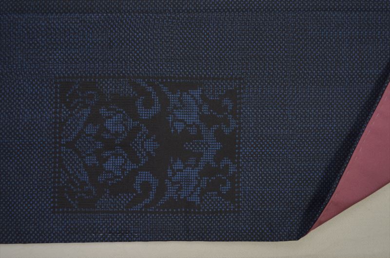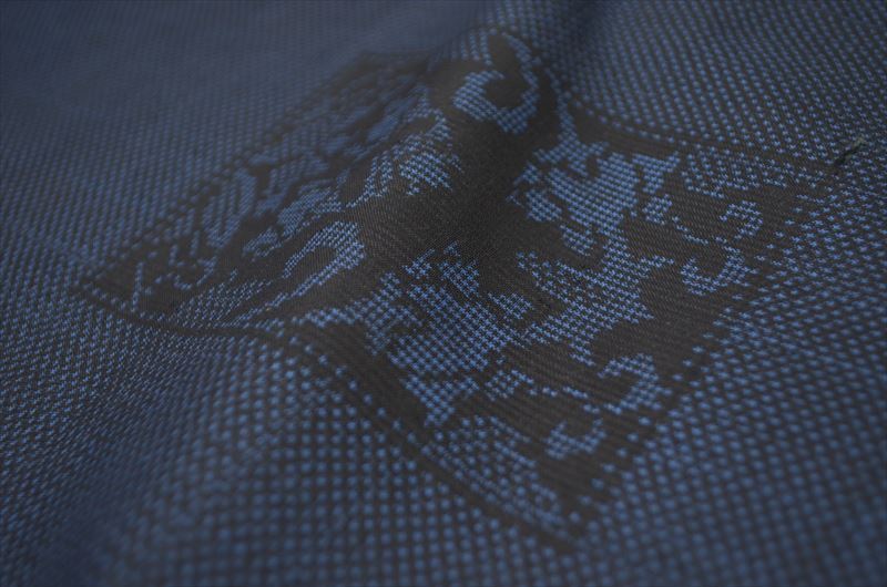 かるた模様のような柄を一元式にて織り上げた本場大島紬です。