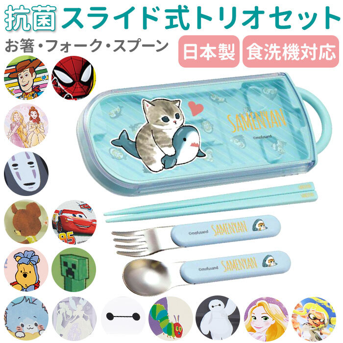商品説明 | ・・人気キャラクターの絵柄がキュート♪キッズ用のお箸・フォーク・スプーンがケースに入ったトリオセットが登場。 ・ケースは指で引き出すスライド式で、衝撃に強く丈夫な構造。 ・内部はカトラリーがぴったり収まる仕切り付きだから、お子さまでも簡単に収納が可能。 ・ケースは分解して洗えるので衛生的。食器洗い&乾燥機の使用もOK! ・抗菌効果のある材質を使用しているから、ママも安心。 ・おハシにはお名前を書けるスペース付き。ケース用のお名前シールも付属。 |