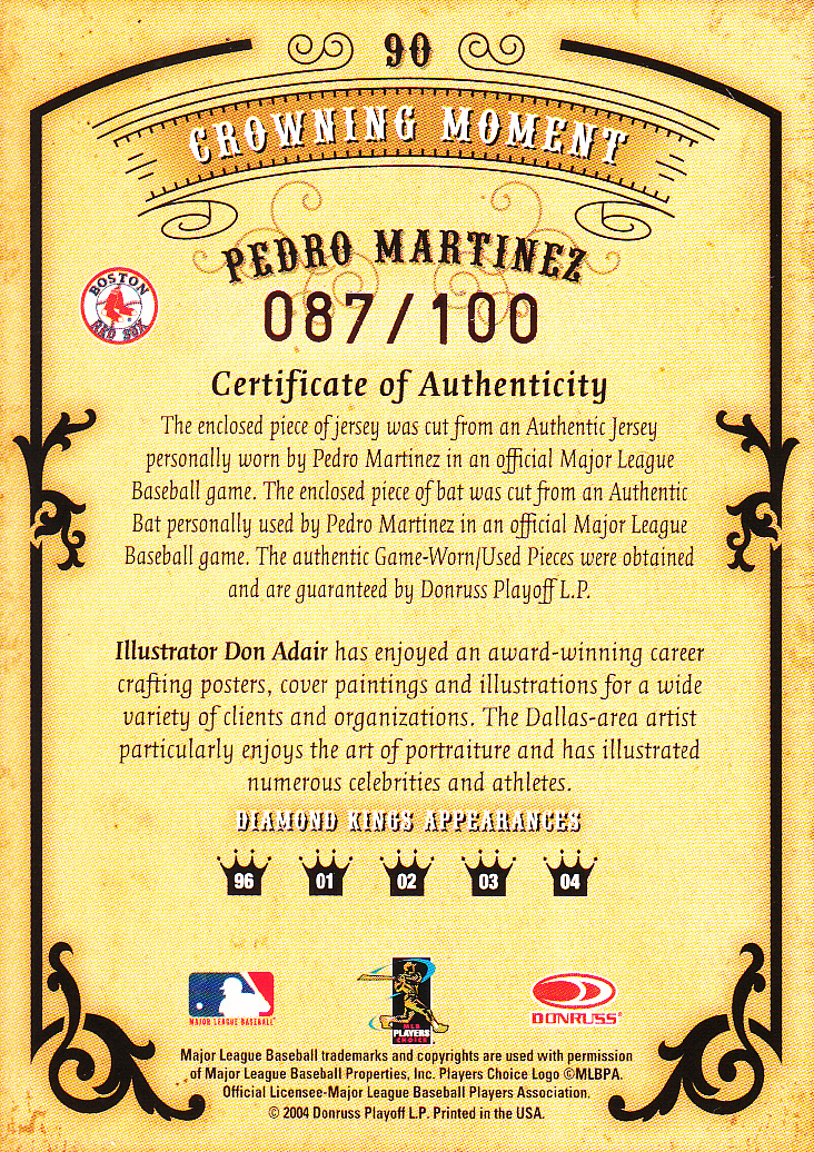 2004 DONRUSS DIAMOND KINGS 'PEDRO MARTINEZ' GAME-USED JERSEY&BAT カード 087/100 | |