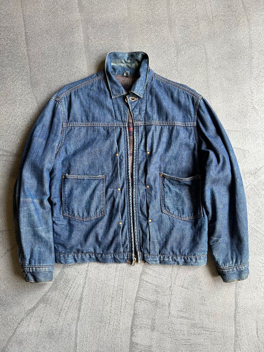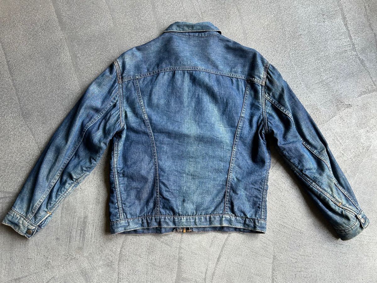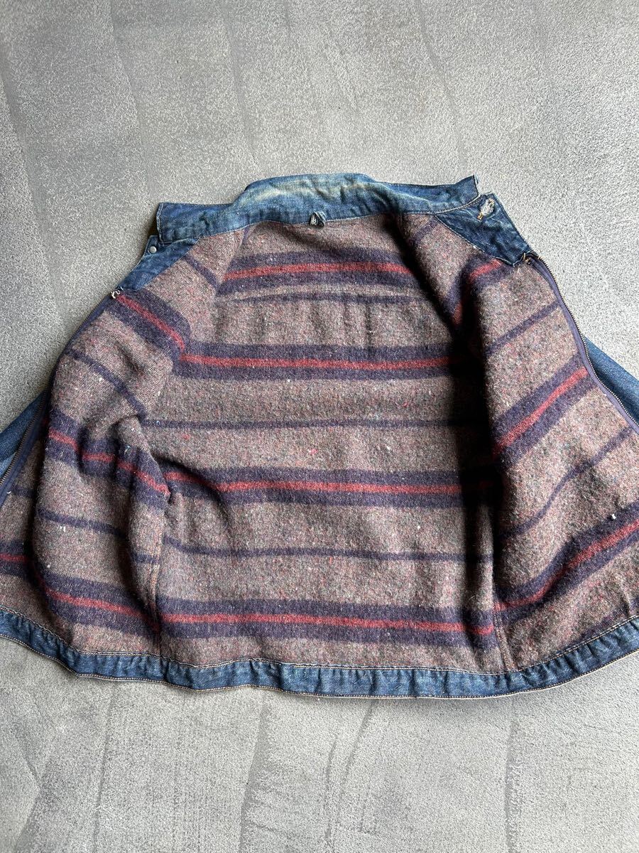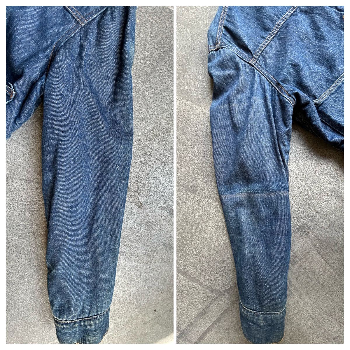 全体的に糸ホツレ、薄いシミ左腕小穴1箇所右腕デニムの色むらなどありますが、変な縮みが無く年代から考えてもとても状態が良いです。
