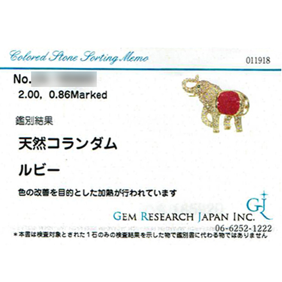 商品名 | GRJソーティング付 ルビー 2.00ct ダイヤモンド 0.86ct K18 ゾウ ブローチ |