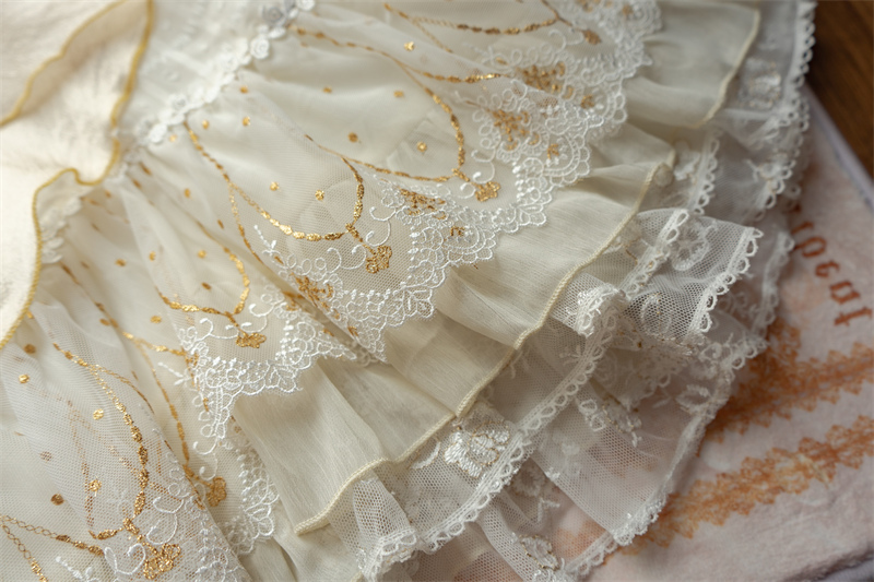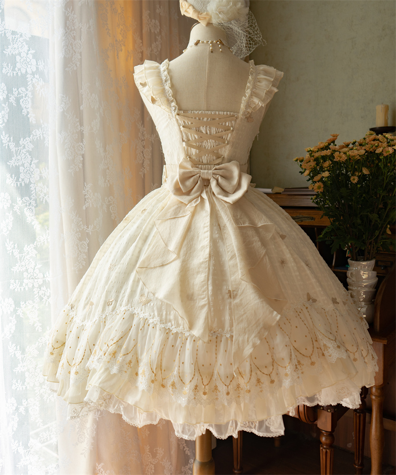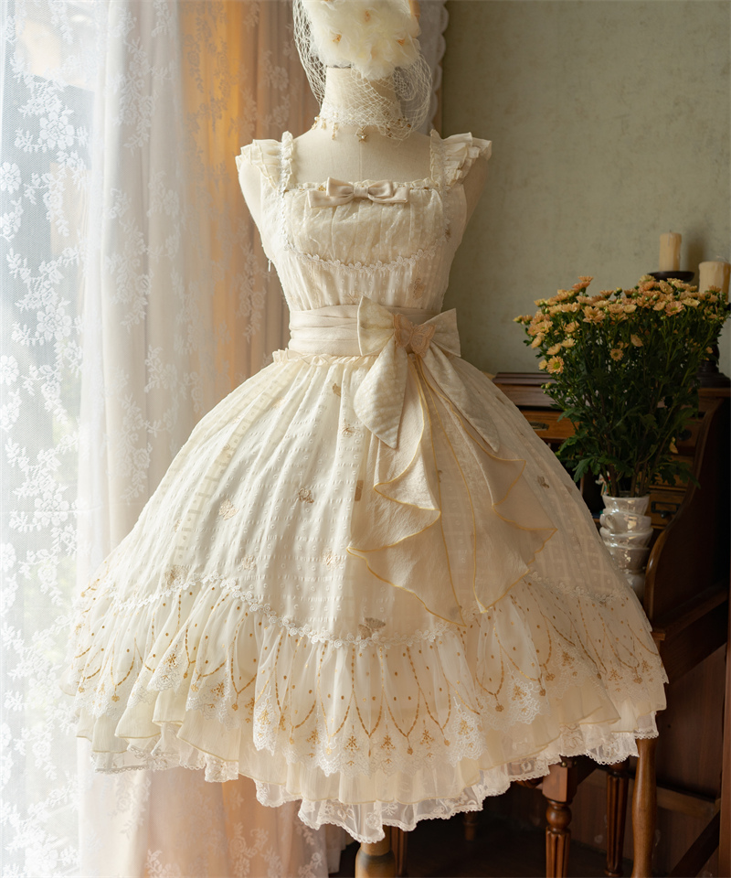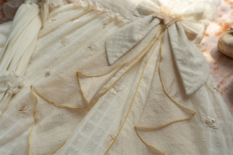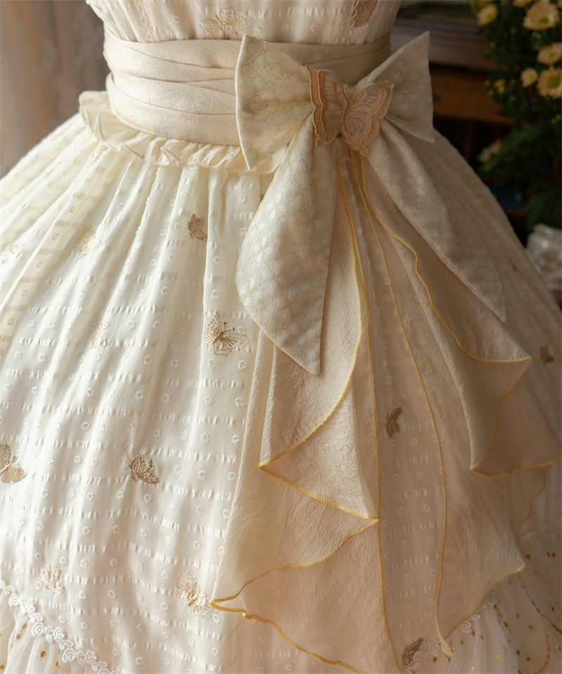 上品で優雅な雰囲気のクラシックロリータワンピース♪ 地紋の入った生地を使い、スカートには繊細なゴールドの蝶刺繍があります。 裾にはレースが装飾され、さらに重厚感を演出します◎ 背中についたリボンと、付属のリボンのついたベルトがとってもエレガント! ベルトのリボンは取り出せません。 背中のリボンは取り外し可能です。 注:この商品はワンピース+ベルト1点のみです。ネックレスと髪飾りなどは含まれていません。 ◆カラー: オフホワイト ◆素材:ポリエステル 裏生地:綿 ◆サイズ:S,M,L,XL