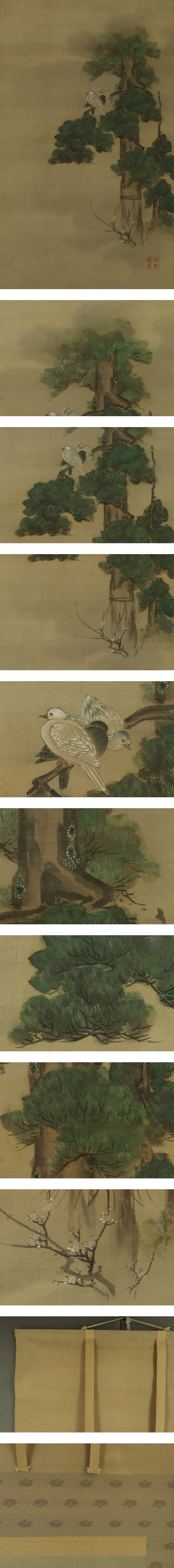 守住貫魚 もりずみ-つらな(1809-1892) 江戸後期-明治時代の日本画家。 文化6年7月11日生まれ。阿波徳島藩の絵師。住吉弘貫に学ぶ。 明治13年大阪に移住。17年内国絵画共進会で「高綱宇治川先登図」「竜門」が金賞。 帝室技芸員。明治25年2月26日死去。84歳。 初名は輝義,定輝。字は士済。通称は徳次郎。号は回春斎,寄生軒。 本紙は、染み、軽い皺、ヤケ、剥落があります。 表装は、染み、汚れ、折れ、皺、軽い浮き、ほつれ、虫食い、箱に修理痕があります。 【サイズ】 作品 横約40cm×縦約98cm 表装 横約53.5cm×縦約195cm |