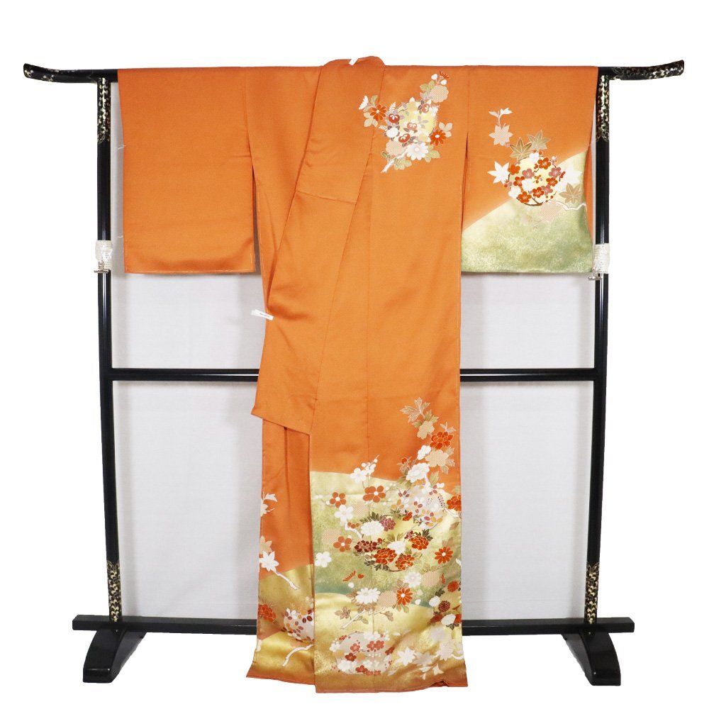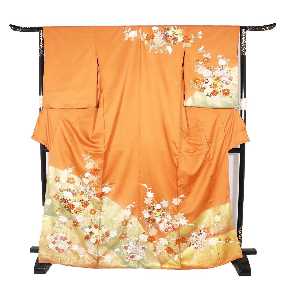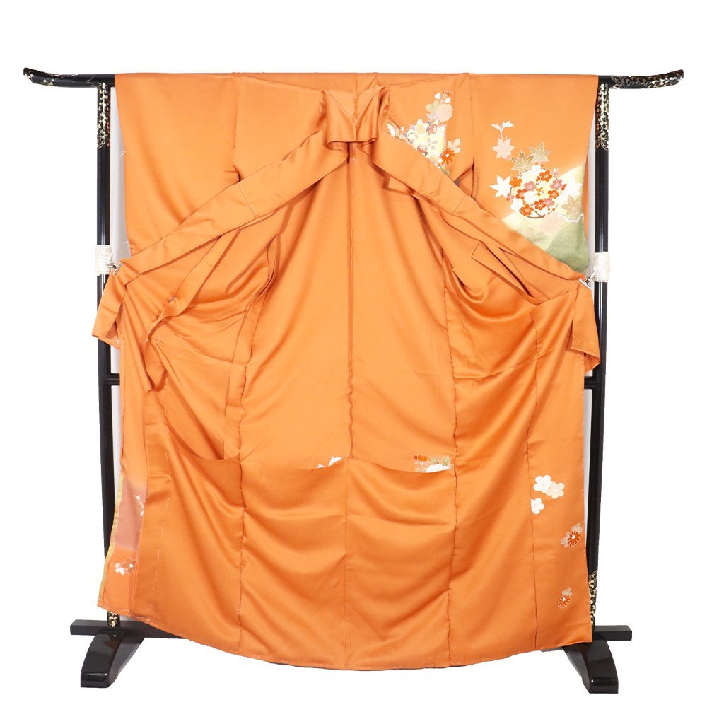 | 仮絵羽 訪問着 丹後縮緬地 レンガ色・金箔・暈し地 花丸文 広襟 八掛け付き 未仕立て 新品 仕付け付き | |